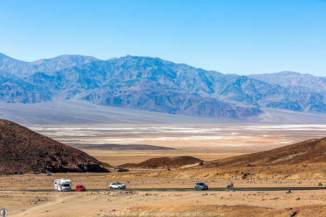 데스밸리 계곡에서는 빠져나왔지만 여전히 데스밸리 국립공원 내부. 알래스카를 제외한 미국 본토에서 가장 넓은 국립공원 (330만 에이커, 참고로 경기도 면적이 252만 에이커)이니 빠져나가는데만 1시간 이상이 걸린다. 집으로 돌아오는 길 49ers 들이 지나온 길을 따라 나오니 직선으로 뻗어있는 190번 도로가 휘어진 듯 곧은 듯 사막을 가로지르고 있다.