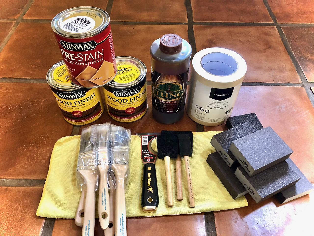 그래서 준비한 물품들. 왼쪽 위의 3가지는 외부에 노출된 창문과 도어용 스테인 페인트, 그 오른쪽은 실내용 가구에 칠할 오동나무 기름, 그 오른쪽은 페인트 칠할 때 커버할 마스킹 테이프. 그리고 시계 방향으로 각종 사포와 가구용 스펀지, 페인터용 만능 도구, 그리고 붓들. 일단 이 정도 준비해 놓고 코로나 노가다를 시작한다.