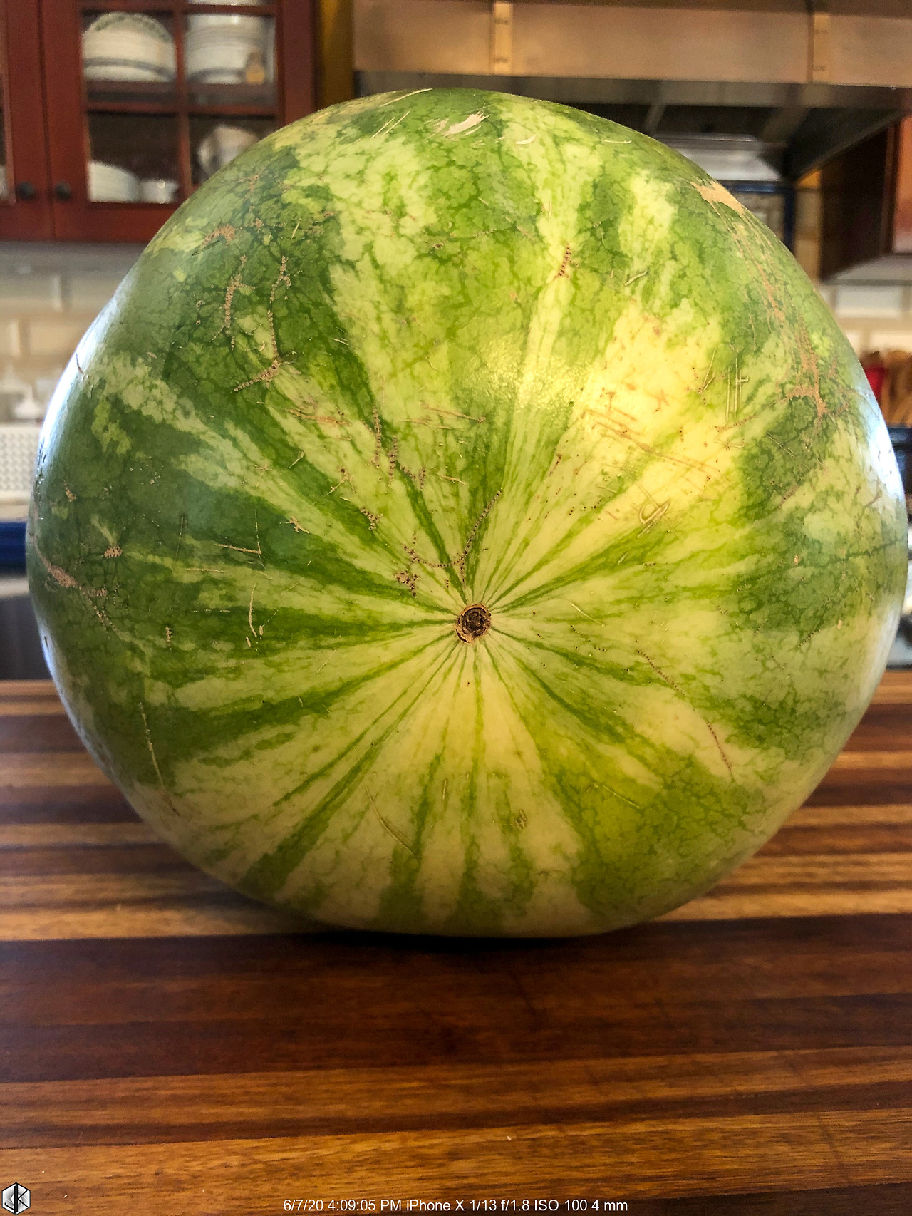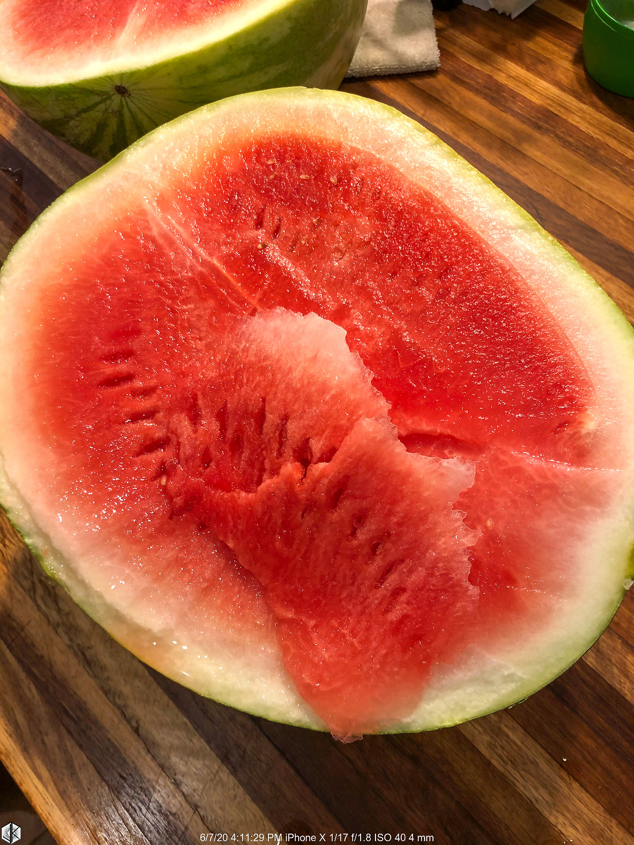 탯줄이 달려 있는 꼭지 쪽 배꼽 감별법이 있는 반면, 배꼽 반대쪽 수박 똥꼬를 살피는 방법도 있다. 작고 깨끗할수록 맛있고 당도가 높다는 얘긴데 애매하지도 않고 간단하고 기억하기 쉬워 좋다. 딱 이 한 가지 기준으로 시험 삼아 마켓에서 바로 한 덩어리 사 와서 쪼개 본다.