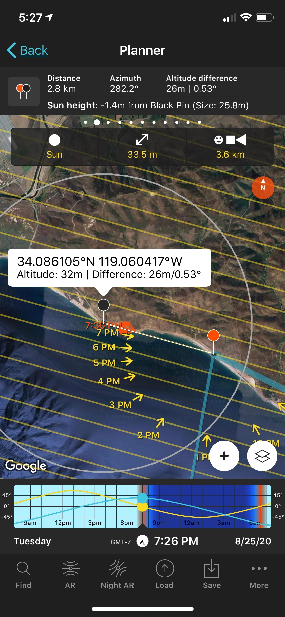 회전각 282도에 태양이 수평선에서 1도 이하인 날을 찾으니 8월 25일이라고 알려준다. 요즘은 어플이 과학이다.