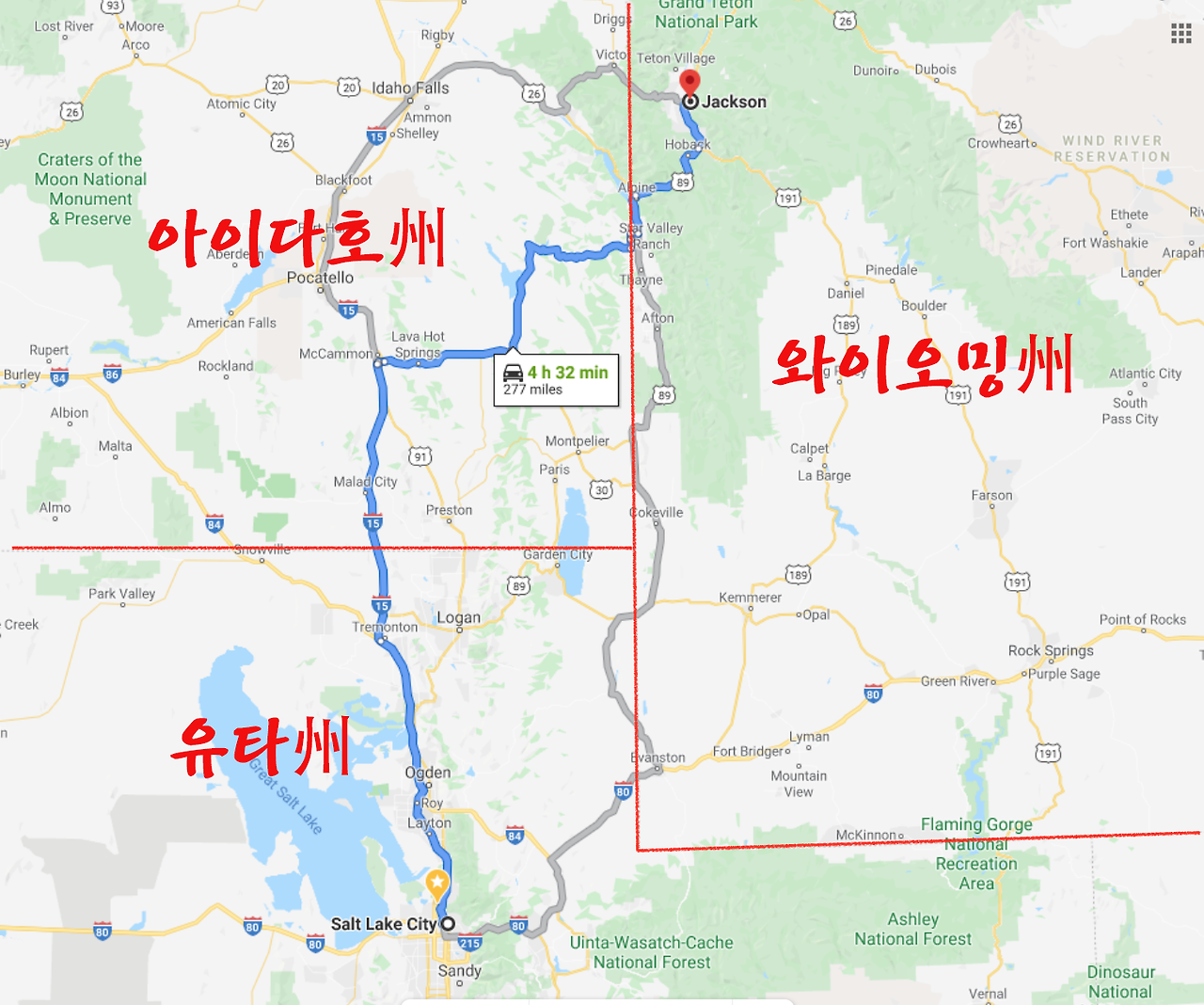 아침에 유타 솔트레이크 시티를 떠나 아이다호를 거쳐 와이오밍까지 들어가는 3일째 이동 일정.