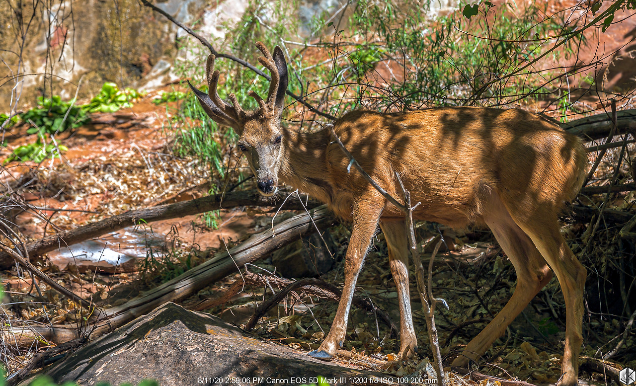 올라가는 도중에 뿔이 막 자라기 시작한 사슴 한쌍이 풀을 뜯다가 눈길을 준다.