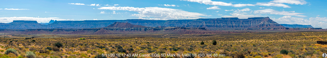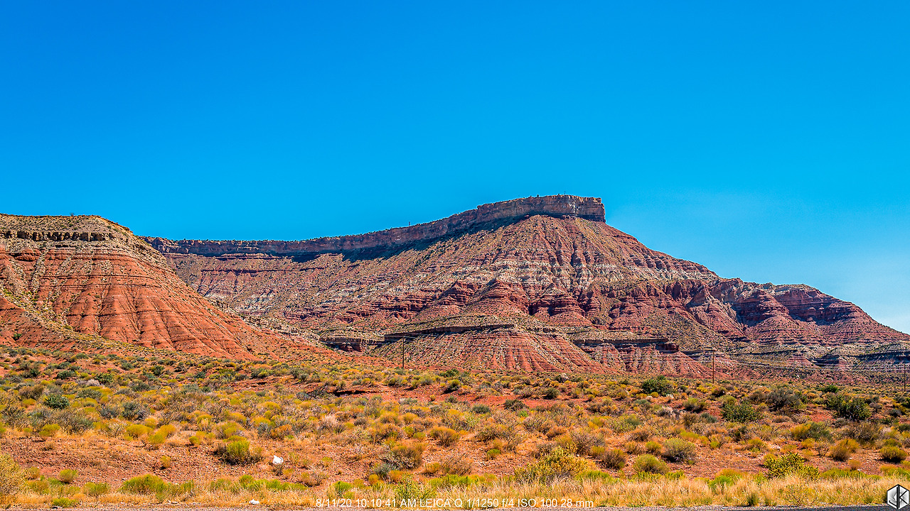 두둥하고 나타난 거대한 메사 덩어리. 잠시 멍하니 바라본다. 위쪽이 평평하고 주위 경사가 가파른 지형을 메사라고 하는데 유타, 애리조나, 네바다, 콜로라도 지역에 사암(sand rock)이 많은 특성상 메사가 아주 많다.
