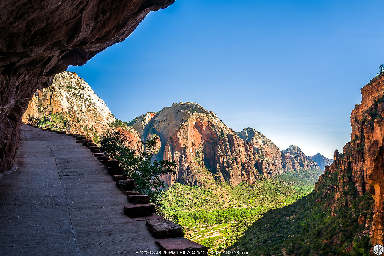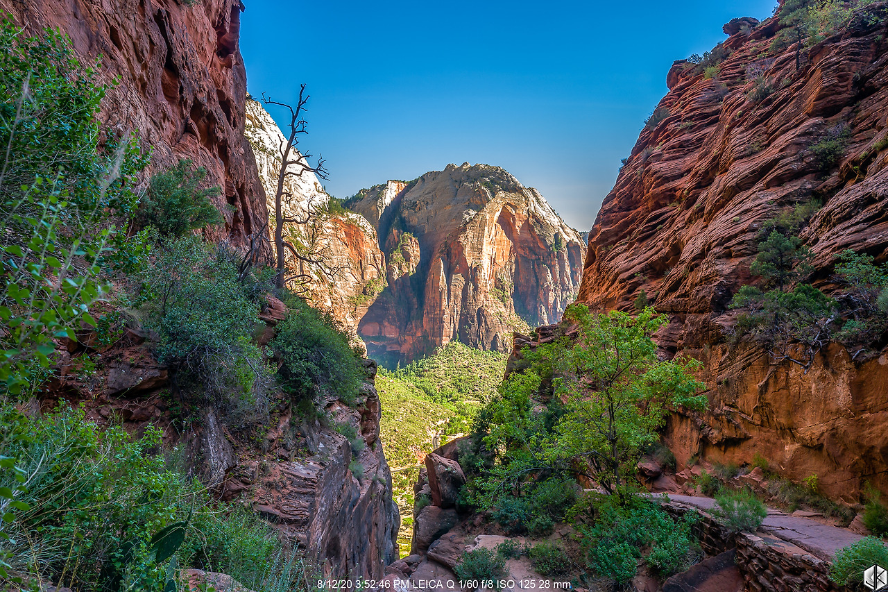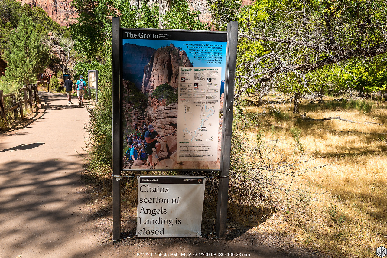 버스에서 내려 트레일에 들어서는 순간. 어라? 뭣이여? 엔젤스 랜딩 클라이맥스 체인 섹션이 출입금지. 한여름 기온이 너무 올라가니 체인이 너무 뜨거워져서 체인을 놓칠 경우 생길 사고를 방지하고자 한 것은 알겠다. 장갑을 챙기라고 하면 될 것을… 애석하지만 오늘은 체인 섹션 전까지만 인연이 닿았나 보다. 암튼 가는 데까지 올라가 보자.