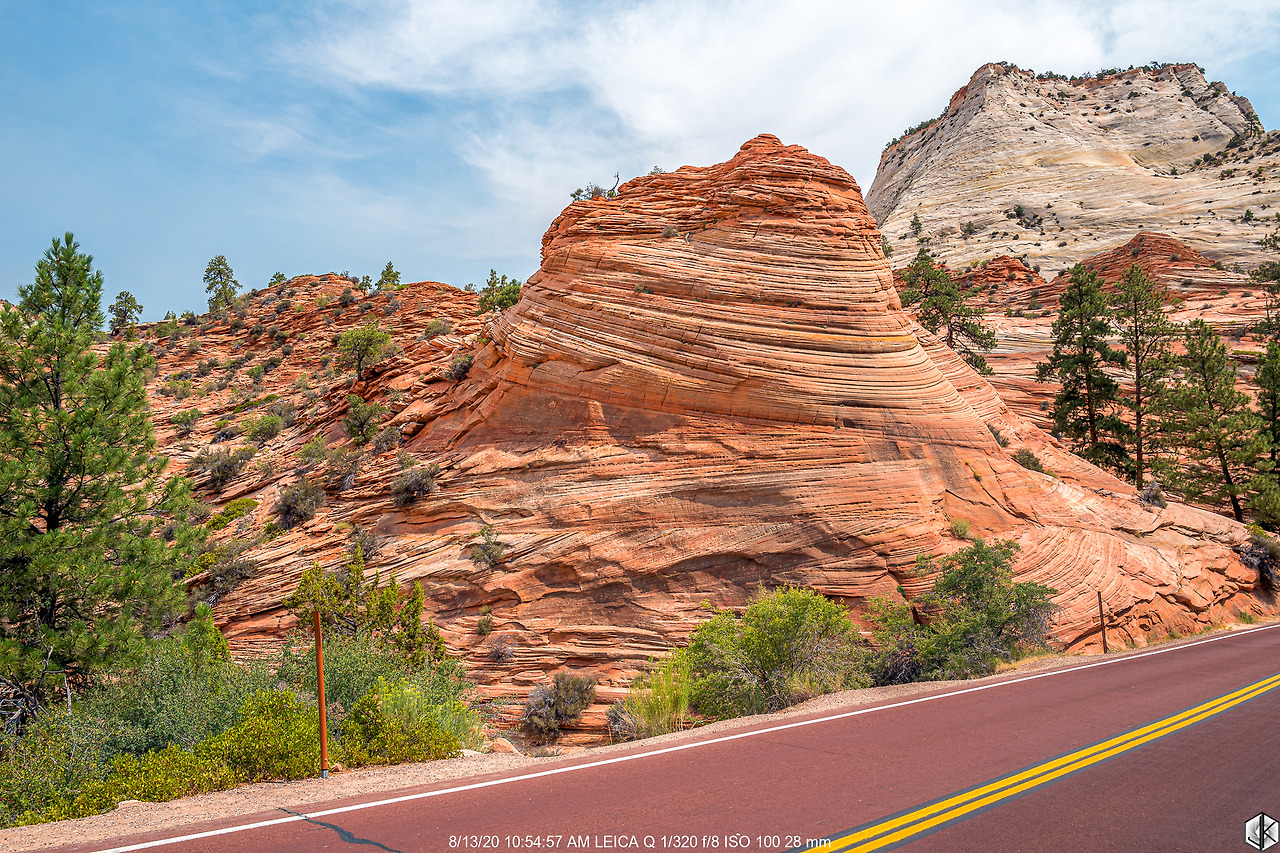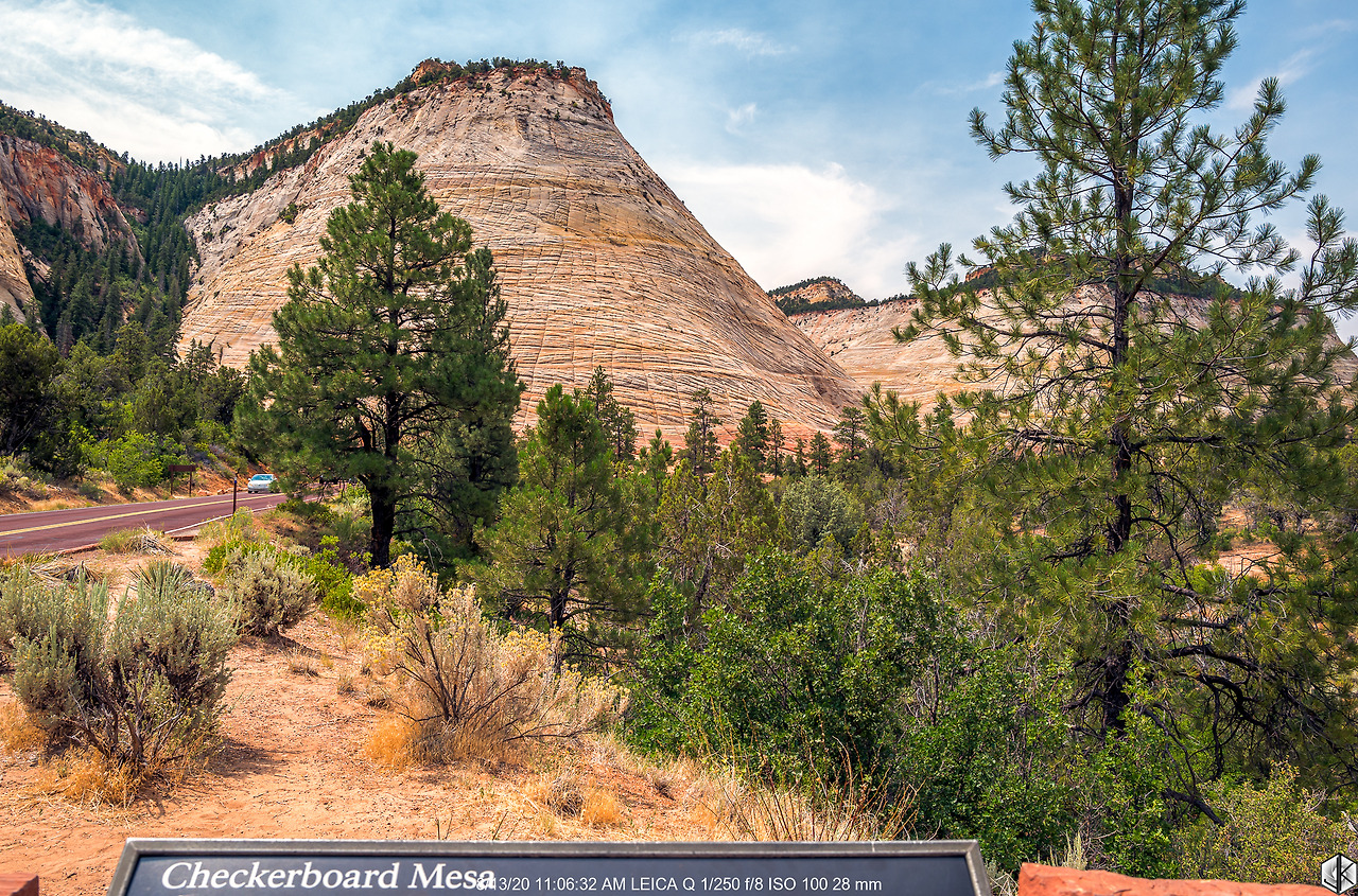 이스트 게이트 바로 옆, 원주 옆면에 장기판 모양의 무늬가 있는 체커보드 메사. 여기까지 오면 자이언 국립공원 동쪽 끝까지 다 본 것. 이제 다시 방향을 돌려 터널 쪽으로 향한다.