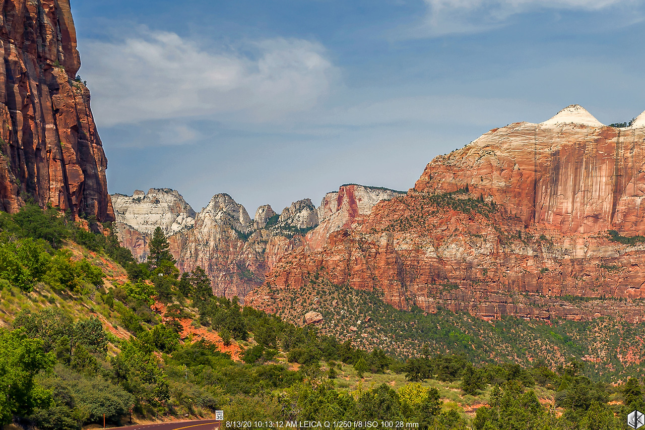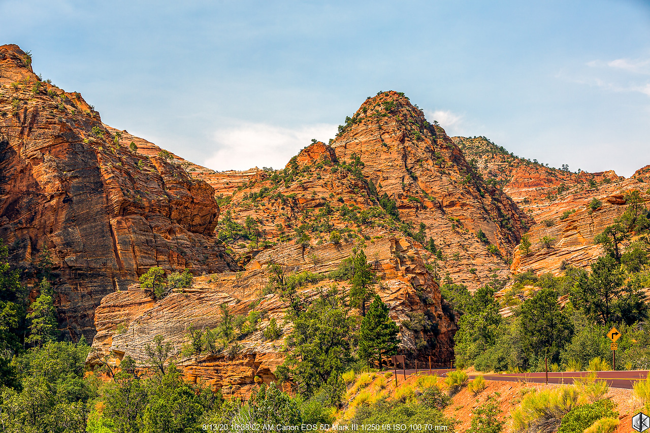 자이언 마운틴 카멜 하이웨이라고 쓰고 고갯길이라고 읽어도 되는 시닉드라이브 위에서 바라본 웨스트 템플 마운틴. 아침 일출 구경하다가 햇살 걸린 모습을 구경한 바로 그 산이다.