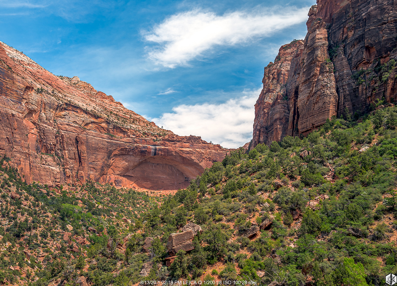 사방이 암벽으로 둘러싸인 캠핑장. 그 대신 일출 일몰은 그림자만 구경할 뿐이다. 별 기대 없이 카메라 둘러메고 나섰더니 몇 걸음 가지 않아 자이언 캐년에서 가장 높은 봉우리 웨스트 템플에 걸린 아침 햇살을 건진다.