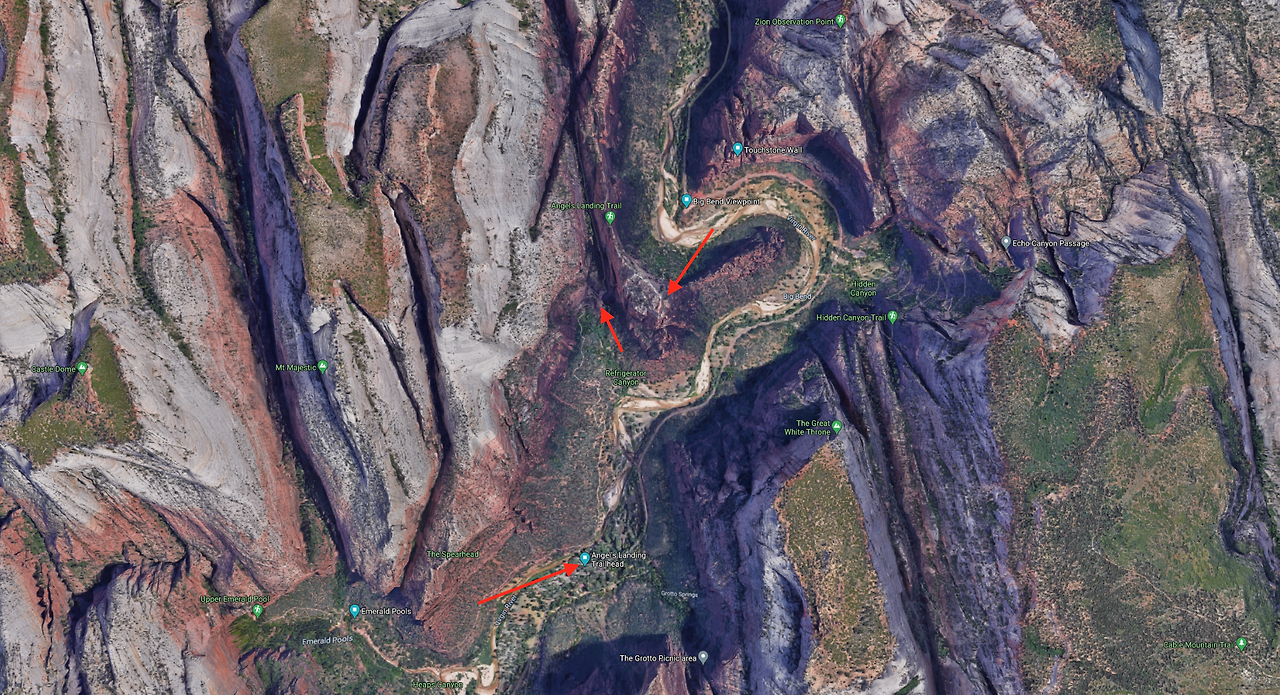 엔젤스 랜딩은 1916년 탐험대가 처음 이곳을 지나면서 “여긴 천사나 내려앉을까 사람은 올 수 있는 곳이 아녀!”라고 이야기한 데서 그 이름이 유래하는데 10년 뒤 국립공원 관리소장을 지낸 월터 아저씨가 바위산 스위치백 21개의 공사를 마무리함으로써 일반인들에게도 정상 접근이 가능하게 되었다.