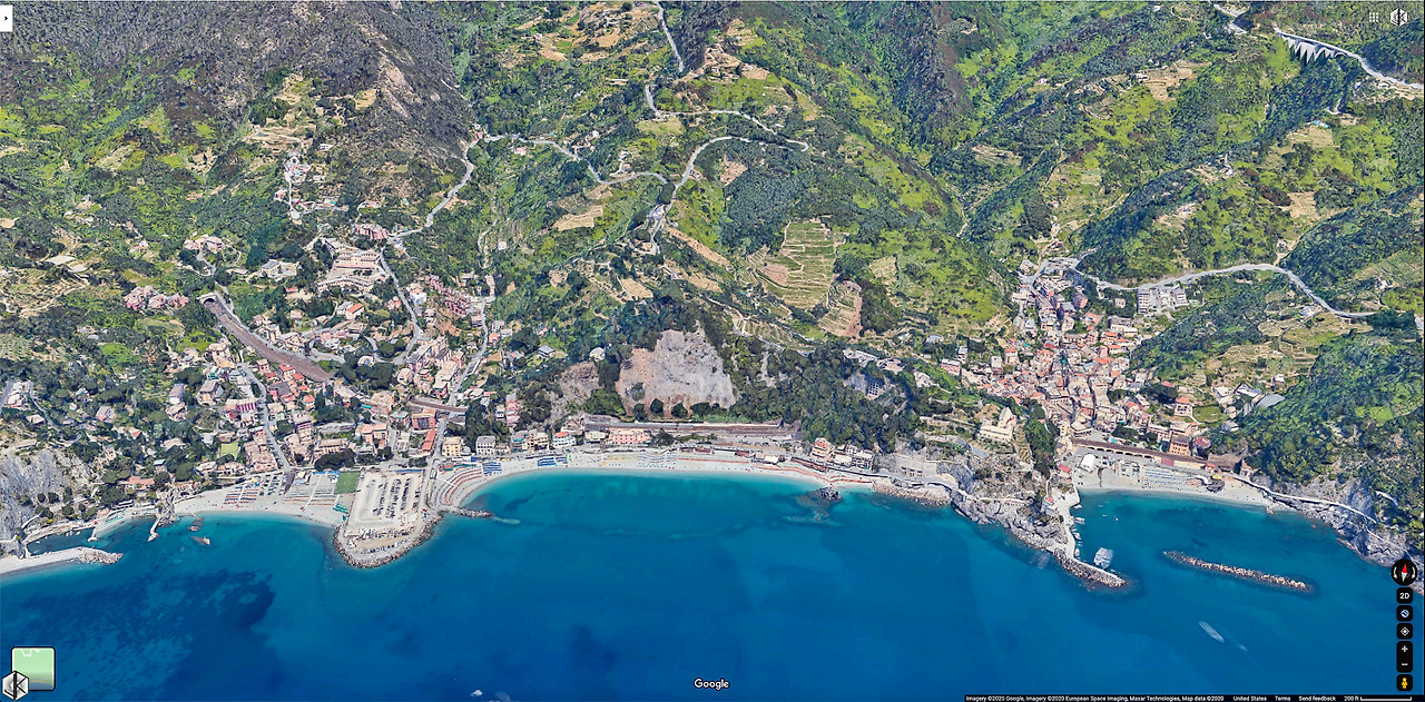 구글 지도를 열어보니 화살표 한 이곳이 기차역. 그래서 앞으로 탁 트인 바다를 보면서도 온통 막힌 느낌이었던 것. 위쪽 화살표는 마을 진입 터널.
