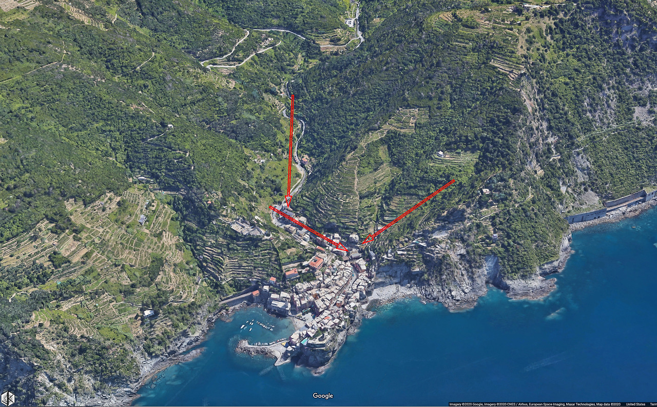 위성지도를 보니 양쪽 산비탈의 흐름이 마을로 모이는 모양새다. 2011년 10월 메디케인(지중해와 허리케인의 합성어)의 영향으로 베르나차 마을은 홍수와 산사태가 발생하여 6개월간 복구를 위해 문을 닫는 아픔을 겪는다.