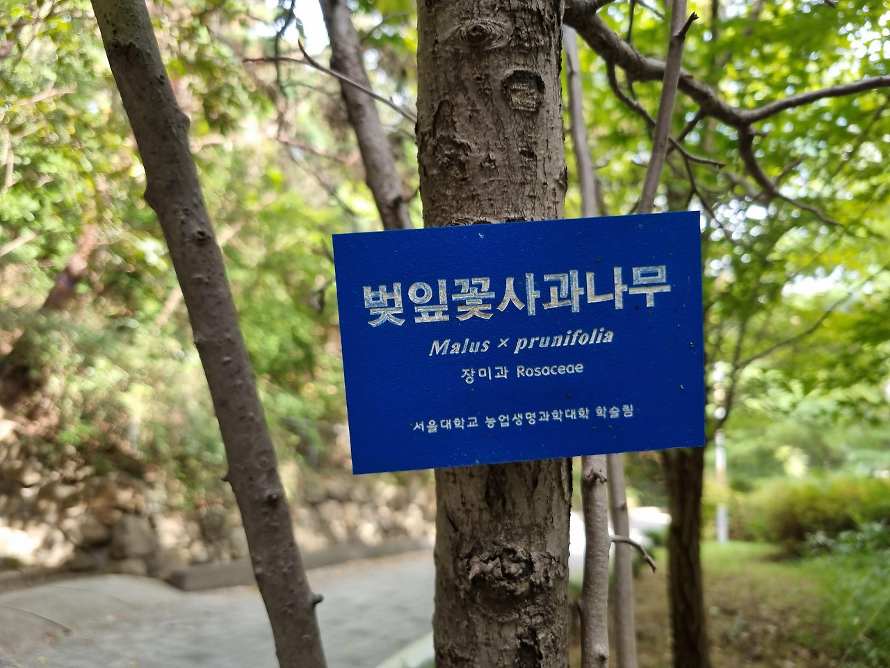 다행히 한울이의 가을 상자에는 아직 빈 공간이 몇 군데 있었다. 나도 한울이와 가을 열매 수집 놀이를 같이 하고 싶었다. 아빠가 같이 한다니 한울이도 기뻐했다. 새로운 열매는 어디에 있을까 고민을 하다가 아내가 공부하는 학교 캠퍼스가 좋겠다는 결론을 내렸다. 학교 캠퍼스에는 나무마다 이름표도 붙어 있고, 또 오래된 나무들이 많아서 열매도 많이 떨어져 있을 것이라는 생각에서였다. 아내는 자기도 학교에서 나무 열매 많이 봤다며 "거기가 좋겠다!"라며 맞장구를 쳐주었다. 그렇게 지난 주말에 만반의 채비를 갖추고 한울이 와 함께 아내 학교 캠퍼스로 향했다.