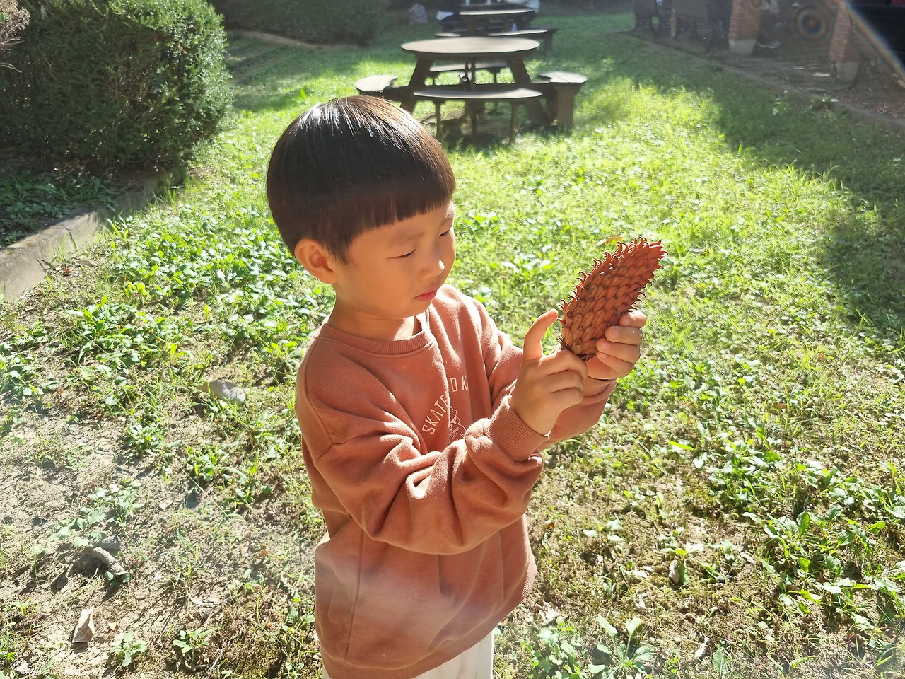 마지막으로 만난 열매는 "일본목련" 열매였다. 앞서 2개 열매 주운 것을 가을 상자에 넣으려고 벤치를 앉았는데, 족히 20m는 넘을 것 같이 커다란 나무가 눈에 들어왔다. "저 나무에도 열매가 있을까?"라고 말하며 같이 살펴보는데 한울이가 "어!! 있다!!! 저기 위에!!!"라며 소리쳤다. 자세히 보니 무성하게 우거진 초록색 넓은 나뭇잎 사이로 빨간색 열매가 보였다. 20m 위를 올라갈 수는 없으니 떨어진 열매가 있기를 바라는 마음으로 한울이와 나무를 향해 달려갔다. 떨어진 열매는 있었으나 대부분 썩어가고 있어서 가을 상자에 담기에는 어려웠다. 다행히 주변에 일본목련이 몇 그루가 더 있어서 한 그루씩 밑동 주변을 살폈다. 그리고 정말 딱 하나 상태가 말끔한 열매를 발견할 수 있었다! 나무가 큰 만큼 열매도 컸다. 커다란 일본목련 열매에서는 이제 갓 딴 과일에서 맡을 수 있는 생생한 향기가 은은하게 퍼져나갔다.
