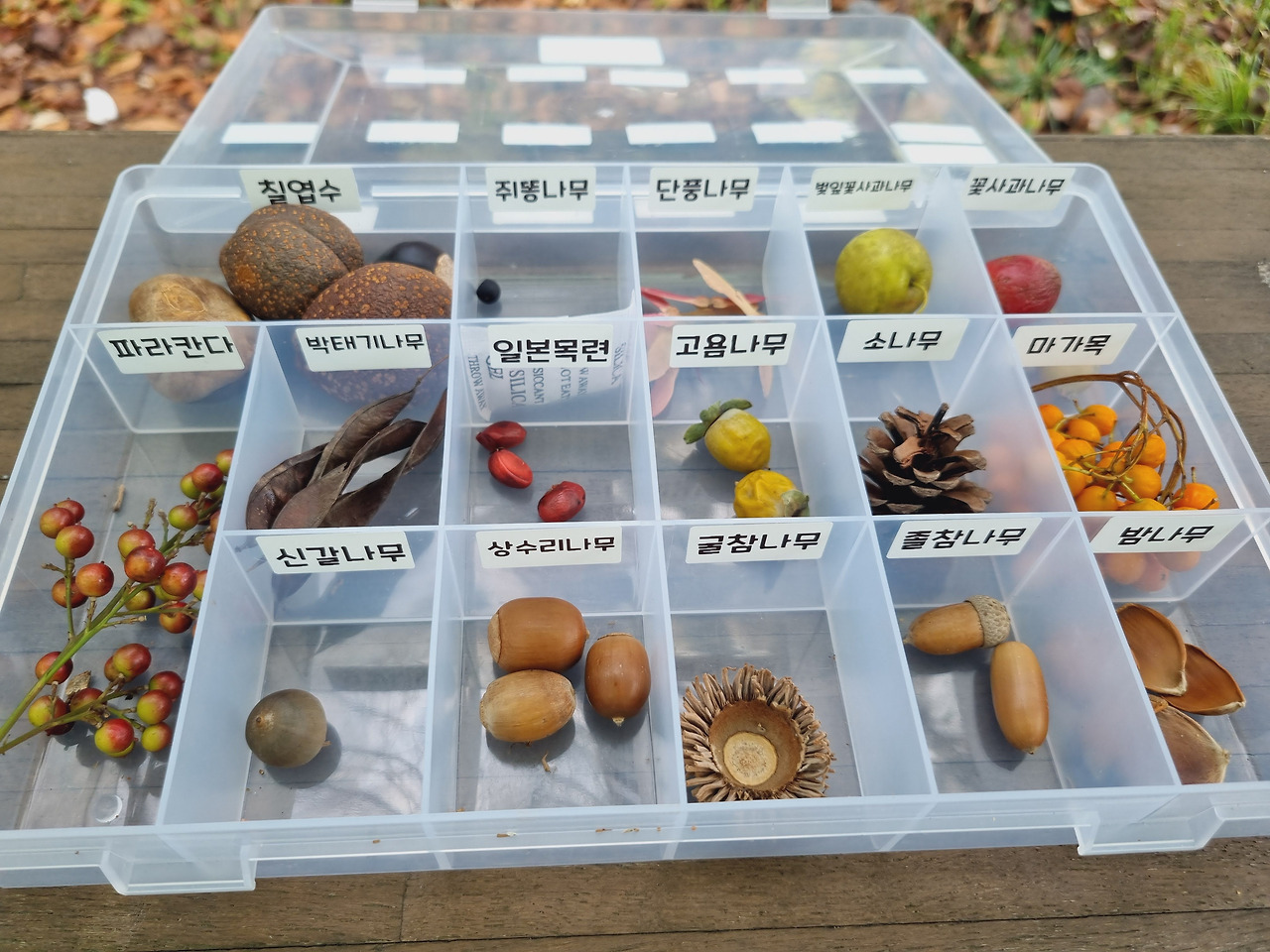 이제 남은 일은 한울이의 가을 상자 안에 열매를 잘 넣어두는 일이었다. 벚잎꽃사과나무 열매, 박태기나무 열매 그리고 일본목련 열매까지. 평소에 무심코 지나쳤을 열매들을 하나씩 고르고 닦고 말려서 상자 안에 넣어 두었다. 어느덧 한울이의 가을 상자는 열매들로 꽉 차게 되었다. 알록달록한 열매들만큼이나 내 마음도 벅차고 뿌듯했다. 나야 오늘 열매 3개를 모으는 걸 함께했을 뿐이지만, 처음부터 모아 온 한울이 마음은 나보다 더하면 더 뿌듯했을 것이다. 열매를 정리해서 넣어두고 아내한테 오늘의 성과를 사진으로 보냈다. 아내는 열매들마다 이름 붙여서 한울이 어린이집에 가져가서 친구들과 같이 보면 좋겠다고 제안했다. 한울이도 친구들하고 같이 관찰하고 싶다고 했다.
