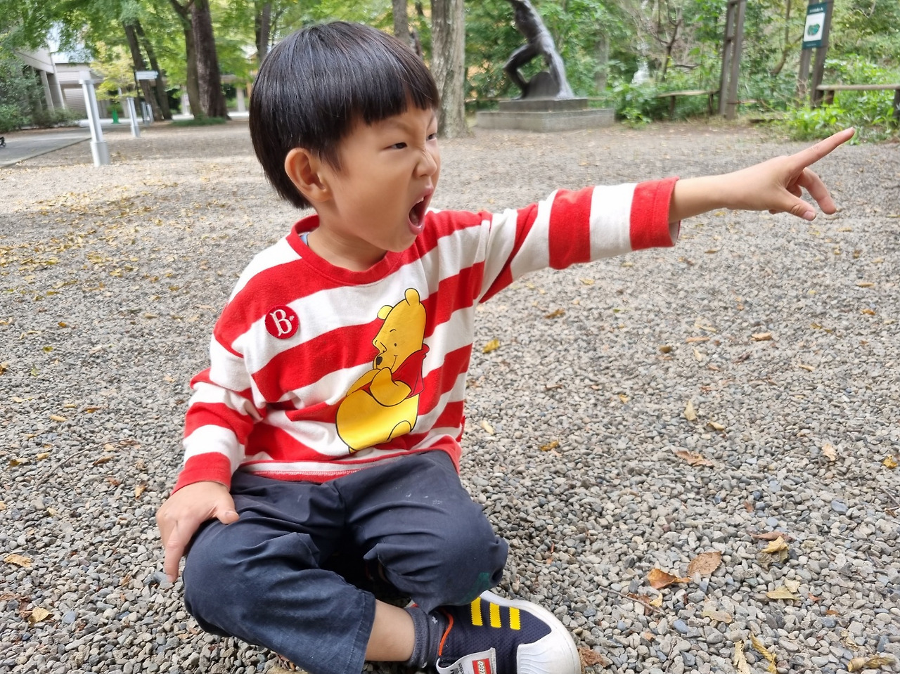 조각상 따라서 손가락으로 앞을 가리키면서
