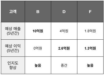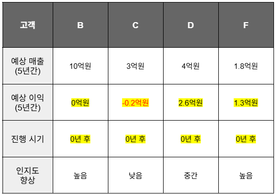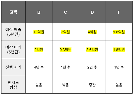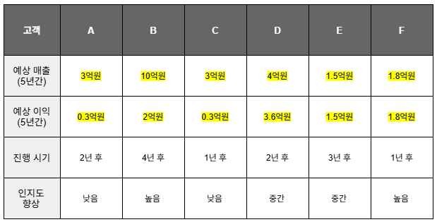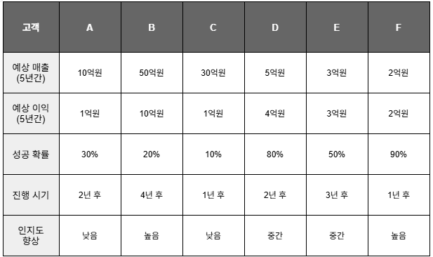 각 고객사를 위 기준에 맞춰 표로 정리했지만, 단순 비교만으로는 어느 대안이 더 나은지 쉽게 판단하기 어려워요. 예를 들어 B안은 매출과 이익은 크지만 성공 가능성이 낮고 진행 시기도 늦었고, D안은 이익과 성공 확률은 높지만 매출과 인지도에서는 다소 불리했죠.