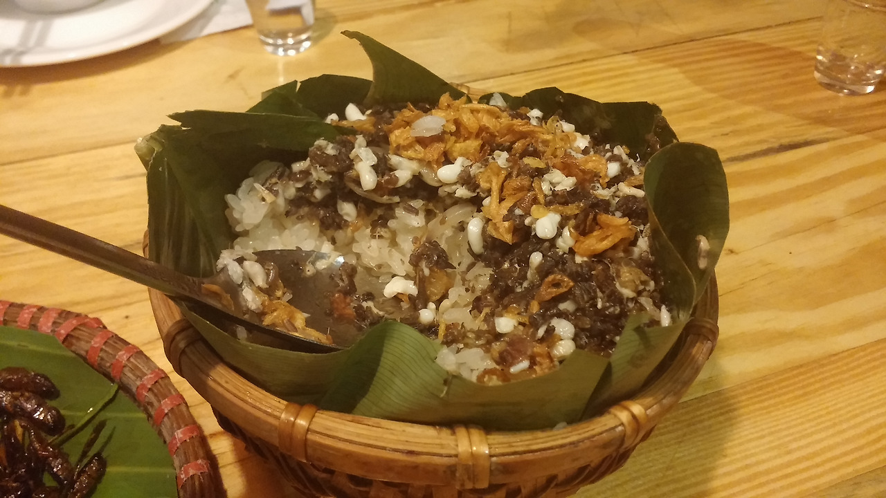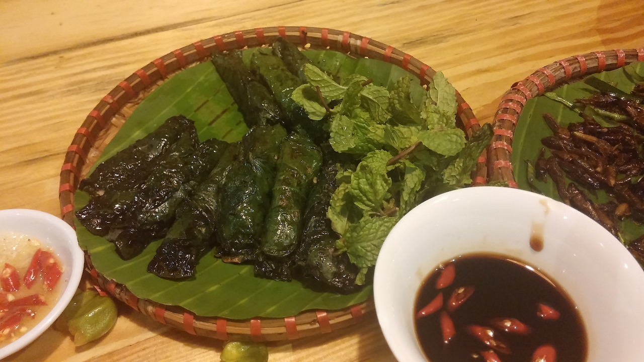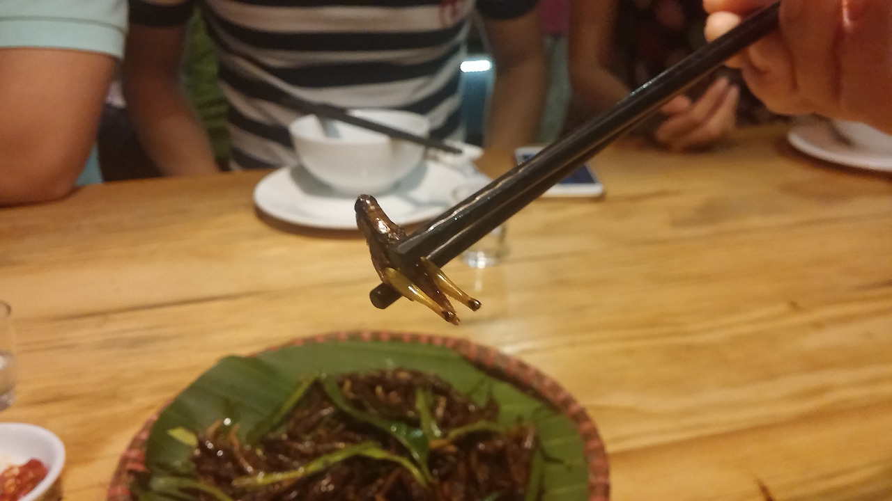 진짜 메뚜기가 음식으로 나왔어요.