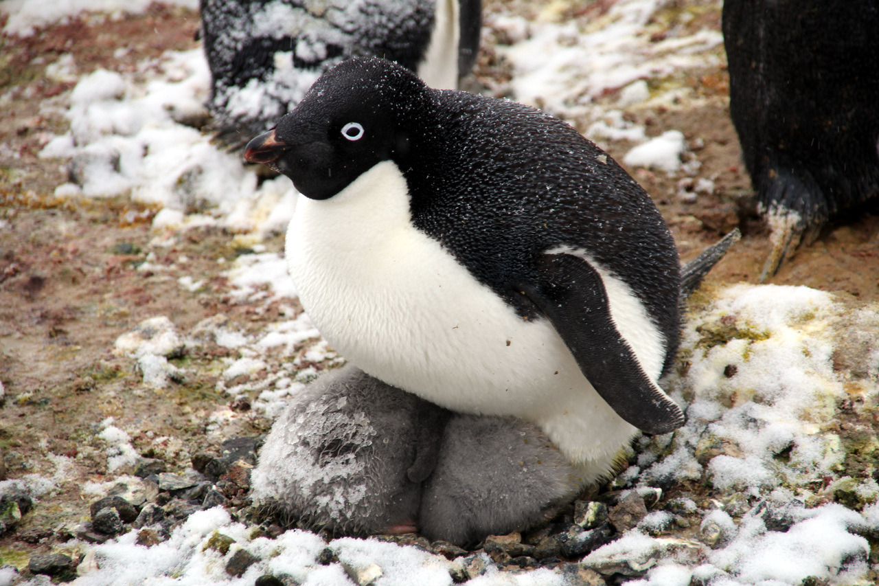 우리는 한마리의 새끼만 키우는 둥지를 찾아보기로 했다. 다만, 새끼가 너무 큰 경우 어미가 받아들이기 힘들기 때문에 어미잃은 새끼와 크기가 비슷하면서 가능한 작은 크기의 새끼가 있는 둥지를 찾기로 했다. 새끼와 함께 아직 부화하지 않은 알을 품고있는 둥지는 제외했다. 어렵지 않게 한마리의 어린 새끼를 품고있는 둥지를 여럿 찾을 수 있었다. 그 중에서 둥지의 위치가 가능하면 번식지의 중심부에 있는 둥지로 결정했다. 입양을 받아줘야하는 둥지의 부모에게는 미안한 일이다. 한마리의 새끼를 키우는 것보다 두마리의 새끼를 키우는 것은 더 힘이들 터이다. 잘못하면 원래 키우고 있던 새끼가 피해를 입을 수 있다. 일반적으로 번식지의 중심부에 있는 둥지들은 새끼를 더 잘 키우고, 번식경험이 많은 개체일 확률이 높다. 이런 기대를 가지고 중심부의 둥지를 선택하고, 한동안 둥지를 관찰했다. 어미는 새끼에게 열심히 먹이를 먹이고, 몸상태도 건강해 보인다. 어미 잃은 새끼 펭귄을 새로운 어미의 배 아래에 조심히 밀어 넣었다. 사람의 접근에 어미펭귄은 경계음을 내었지만, 배 아래 들어온 새끼를 공격하지는 않았다. 한동안 멀리서 둥지를 지켜보았다. 다행이도 어미는 새로 들어온 새끼를 멀리하지 않았다. 입양된 새끼는 겁에질려서 그런지 새로운 어미의 배와 발 사이에서 꼼짝도 하지 않고 머리를 박고 있었다. 팀원들과 제발..간절하게 입양한 둥지를 지켜보았다. 한시간여를 더 지켜보았으나 어미는 다른 새끼가 들어온 것을 아직은 신경쓰지 않는 것 같았다. 새벽녘이 되어서야 우리도 텐트로 돌아갔다. 물티슈로 간단히 얼굴과 발을 닦고 차가운 침낭안에 몸을 누이면서도 새끼펭귄이 걱정되었다. 다음날 일어나 아침식사 준비전에 후다닥 둥지가 있는 위치로 가보았다. 다행히 잘 품고있다. 한동안 바라보니 먹이도 먹인다. 다행이다. 가슴을 쓸어내렸다.