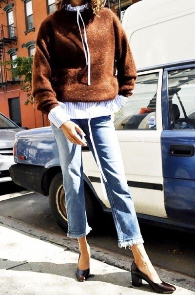 와이드한 핏의 데님은 가운데 벨트나 혹은 어깨가 드러난 탑을 입어주거나 오버사이즈 핏의 데님 자켓. 혹은 니트로된 붐버를 입어주는 것또한 잘 어울릴 것 같다.