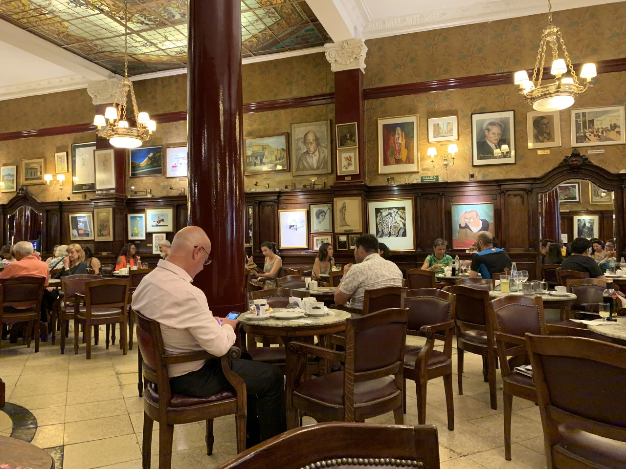 두 댄서의 뜨거운 눈빛만큼이나 날도 무척 뜨겁다. 날이 너무 더워서 쉽게 잃지 않았던 입맛도 상실했다. 오렌지 주스 한 잔으로 해갈해보려 하지만 이 마저도 쉽지 않다. 시원한 곳으로 이동해야겠다. 이번에는 부에노스 아이레스에서 가장 오래된 카페인 ‘카페 토르토니’로 이동했다. 1858년에 프랑스 이민자가 오픈한 카페로, 당시 파리의 문화 엘리트들이 모였던 카페 ‘Tortoni’에서 이름을 따왔다. 160년이 넘는 역사를 이어온 카페로 아르헨티나를 대표하는 저명한 예술가와 문학가들이 많이 찾았다고 한다. 특히 소설가 호르헤 루이스 보르헤스와 땅고 가수 카를로스 가르델이 이곳 카페의 단골이었다고 한다. 영화 <미드나잇 인 파리>가 아닌 <미드나잇 인 부에노스 아이레스>에서 주인공이 시간 여행을 한다면 분명 이 카페에 방문할 것이다. 젠틀하게 턱시도를 차려입은 백발의 서버가 친절하게 주문을 받는다. 밀크셰이크와 Dulce de leche(우유 캐러멜)가 들어간 (끔찍하게) 달콤한 케이크를 주문했다. 아무리 케이크를 좋아하는 나라도 둘세 데 레체의 달달함은 감당하기 쉽지 않았다.
