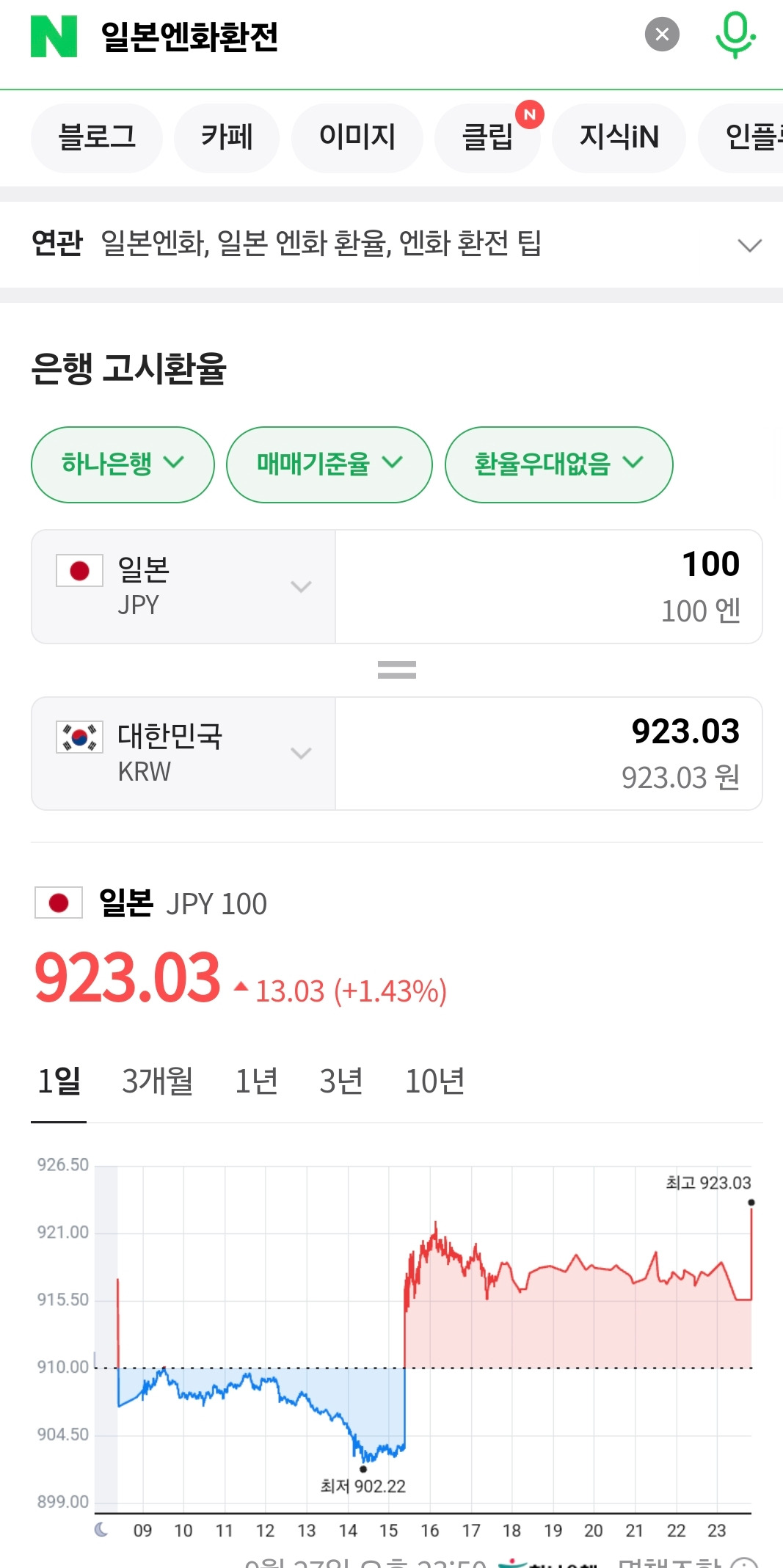 환율은 항상 바뀌기에 여행 전후로 항상 체크하는 것이 좋다. 엔저에서 다시 높아지고 있지만 아직은 900엔 초반으로 환전이 가능하다. 오늘자 환율은 923.93이다.