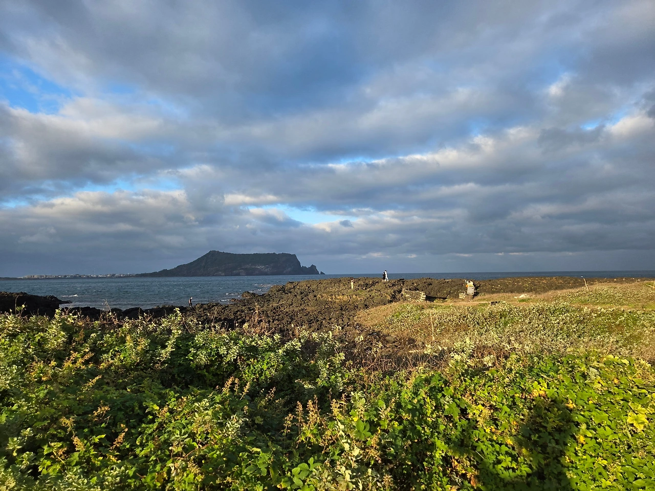 사실 아쿠아플라넷에서 성산일출봉까지는 차량으로 이동해야 하는 거리이다. 원거리를 활용한 성산일출봉과 인증숏을 담기에는 최적의 장소이기도 하다. 야외로 나오게 되면, 이렇게 성산일출봉을 함께 배경으로 사진을 담을 수 있는데, 바다와 세계문화유산 성산일출봉, 그리고 하늘의 풍경에 따라 다라지는 그때의 제주여행을 기억할 수 있다.
