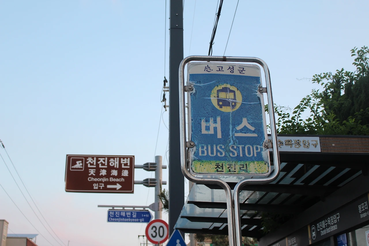 아야진해변을 걷다가 만나는 버스정류장과 이정표. 나는 사실 시골에 가면 버스가 어떤 모습일까 굉장히 궁금하다. 그래서 도롯가에 버스가 지나가면 그 버스를 구경하는 재미가 쏠쏠하다. 색깔과 글자체, 그리고 오래된 시간이 느껴지는 버스의 노후도까지! 고성해변길을 걷다가 갑작스레 만나는 버스.