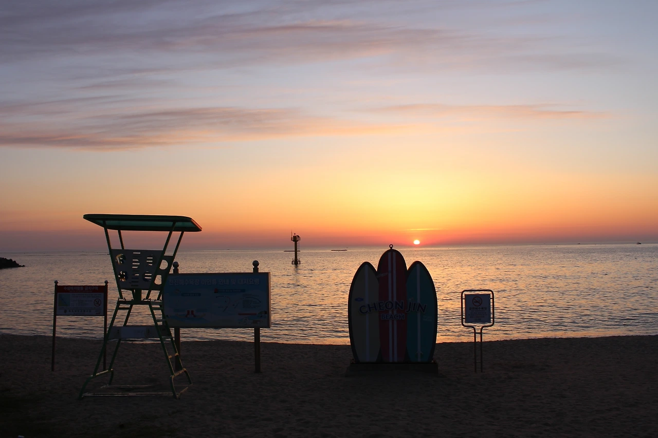 내가 일어났던 시간은 4시 55분, 그리고 해변으로 나온 시간은 5시였으니, 아마 5-10분 사이에 이렇게 고성 천진 해수욕장의 일출을 보지 않았을까? 그리 잠이 많은건 아니지만, 그렇다고 부지런하지도 않다. 아마 내가 모르는 곳에 와서 처음 자는 공간에서 자는게 조금 힘들었을지도 모르지. 그 덕분에 이렇게 스페셜한 일출을 만나보는 날이 오니 나로써는 감사해야 할 일인가?
