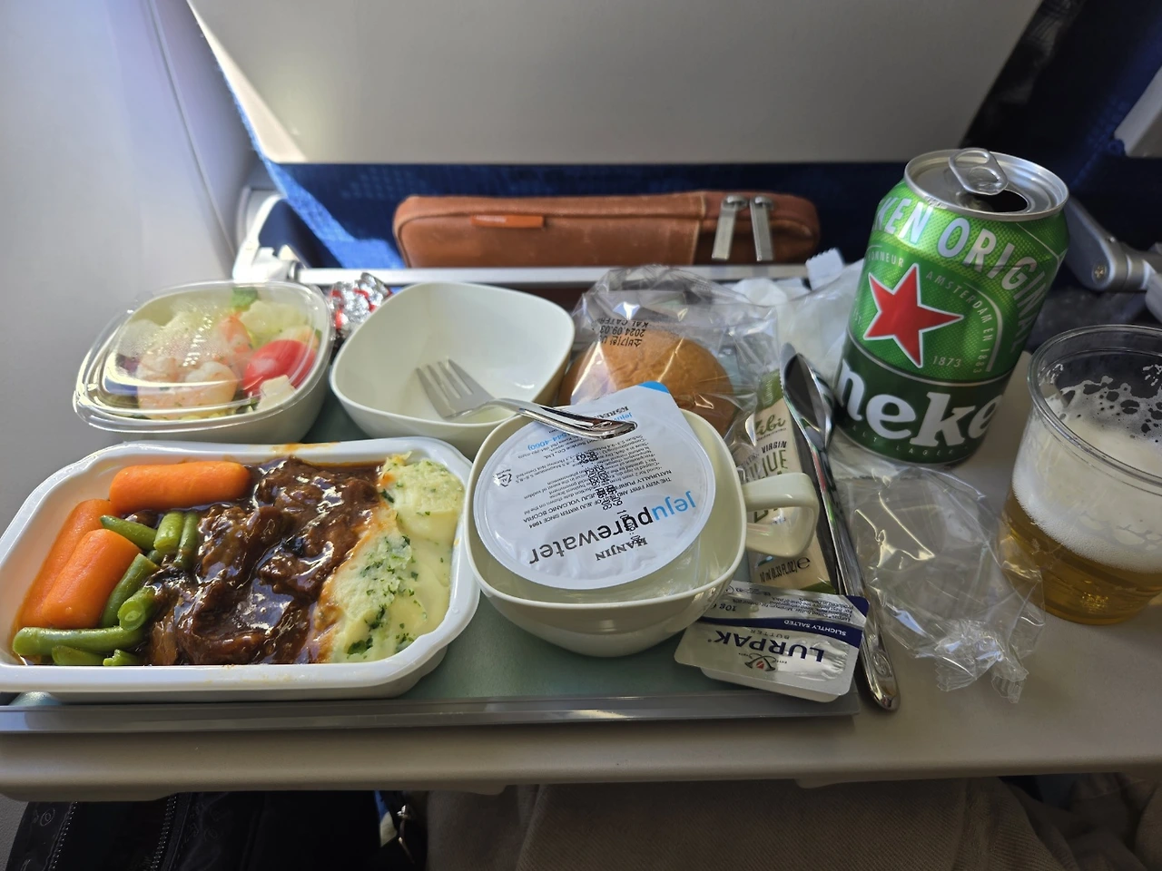 한국으로 돌아가는 길에 먹는 마지막 식사, 식사는 너무나 맛있었다. 소고기와 감자의 맛, 여기에 맥주도 한 캔도 마셔본다. 여행을 정리하고 한국으로 돌아가는 시간에 만나는 기내식도 뭔가 더 맛있는 느낌이야!