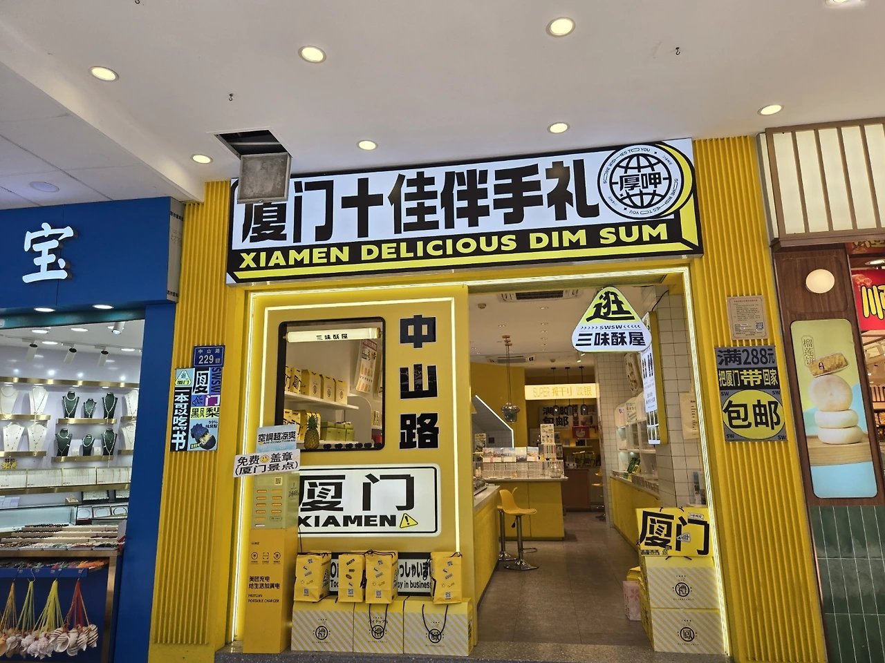 샤먼의 중산루에는 큰 건물 아래 1층이 모두 이렇게 상점가로 연결되어 있다. 그 거리가 꽤나 길어서 대략 걸어서 10분은 걸어야 하는 길이라 그 사이에 상점들이 일렬로 줄 지어 서 있는 모습도 엄청 난 볼거리다. 샤먼은 특히나 망고가 유명한 곳이라, 샤먼만이 가진 맛있는 디저트 선물들을 만나볼 수 있다. 박스 포장도 깔끔하고 이쁘기 때문에 선물용으로 좋다만, 사실 비행기 타고 가져오려니 부피감도 무시할 순 없다. 하지만, 걱정하지 않아도 되는 건, 샤먼공항에 이 많은 가게들의 모든 제품은 아니지만, 샤먼을 대표하는 다양한 디저트들이 판매한다는 사실! 직접 중산루에서 구매하는 것도 좋지만, 공항에서 구매해도 가격차이가 없으니 면세점에서 구매하는 것이 더 편리할 수 있다.