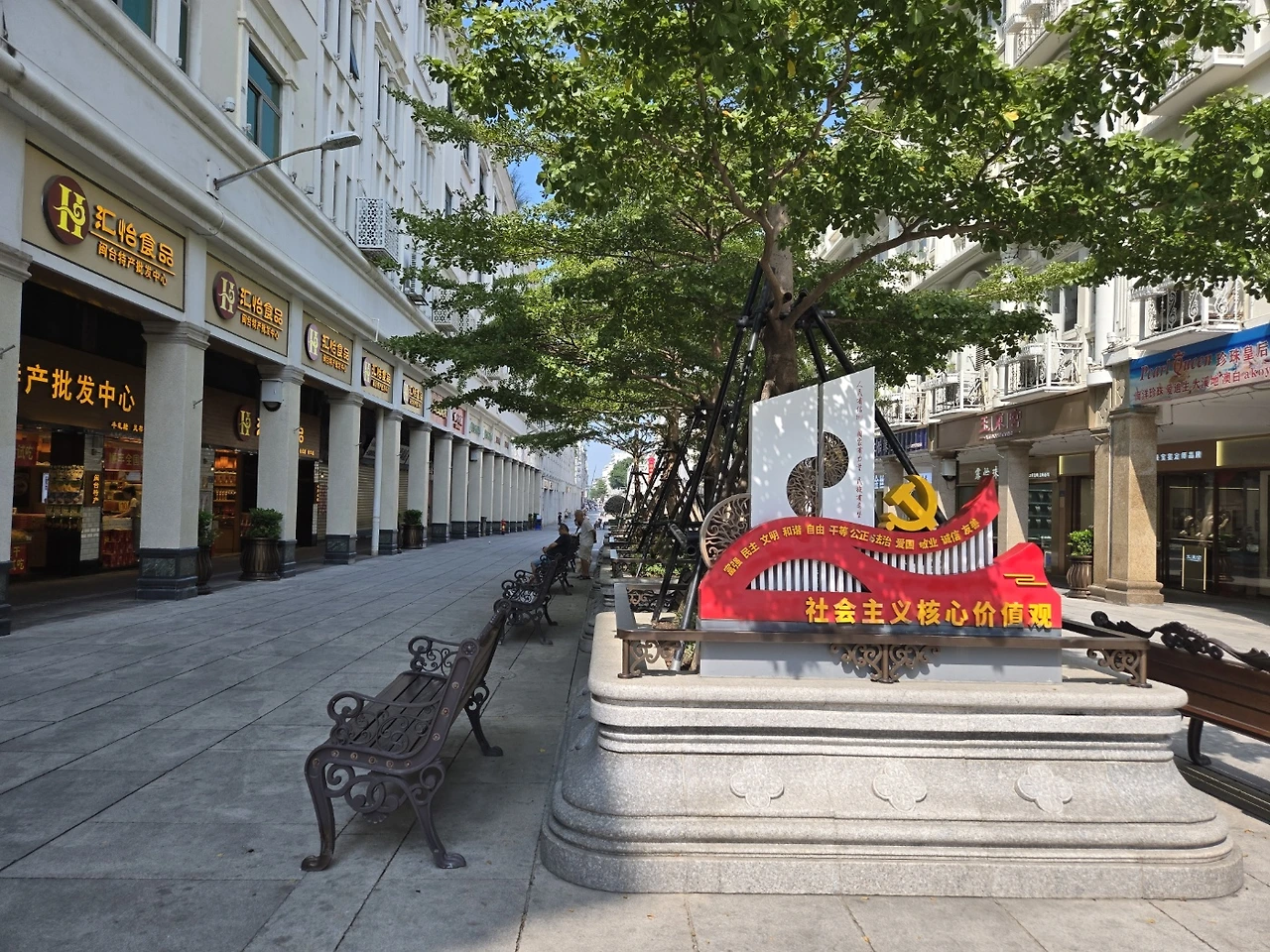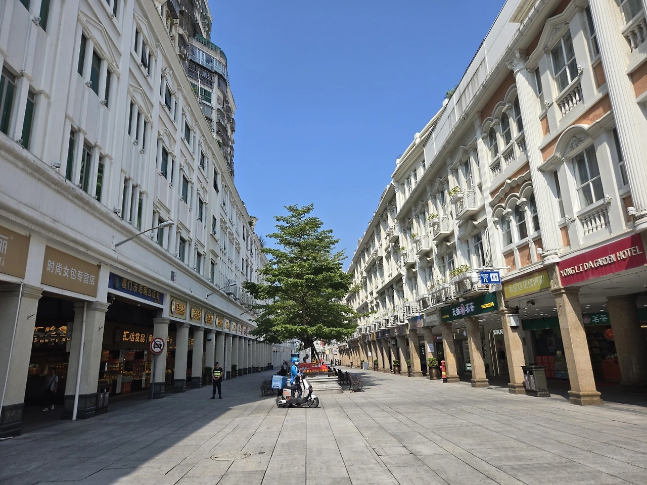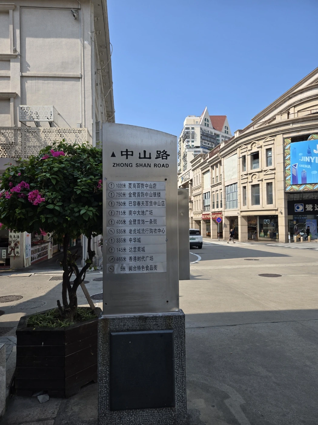 밤이 되면 수많은 사람들이 거니는 곳, 휘황찬란한 네온사인과 북적이는 사람들로 거리가 온통 가득 차는 중산루다. 아침에 만난 이곳은 그런 밤이 낯설 만큼 너무나 쾌적하고 깔끔한 도로의 모습부터, 정돈이 잘 되어 있는 가게 모습에 '어제와 같은 중산루인가?'라는 생각이 절로 든다. 중산루는 이렇게 좌우로 긴 대로변에 상점가들이 1층에 연결되어 있는 형태로, 중앙 광장은 사람들이 걷고 앉아 쉴 수 있는 벤치가 가득하다. 아침에 온 건 나도 처음이었는데, 맑은 하늘에 중심에 우뚝 선 나무 한그루, 그리고 양 옆으로 줄지어 서있는 가게들이 샤먼 중산루의 매력이었다.