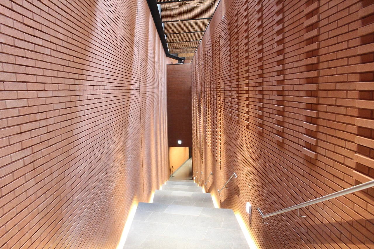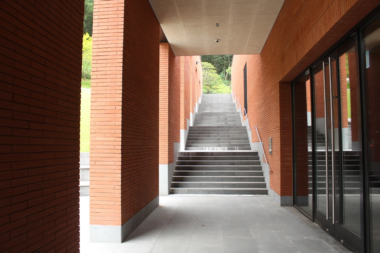 입구에서부터 느껴지는 붉은 건물, 다른 곳이라면 첨탑이 올랐을 자리에 두 개의 거대한 형태가 멀리 남양성모성지 입구에서부터 그 힘이 느껴진다. 숲길을 따라 마주한 입구에서의 컬러감과 머리 위로 뻗는 사선으로 쌓은 벽돌이 참 매력적인 건물이다.