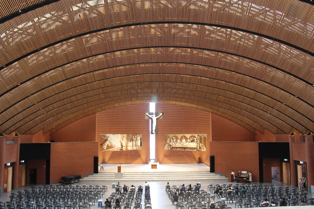 여기에 높이 감과 폭, 그리고 위에서 내려지는 빛의 공간이 정말 공간의 힘을 가져다준다. 여기에 넓은 공간을 기둥 없이 채우는 천정에서 떨어지는 빛까지 더욱 성당의 힘을 가득 메우는 건물에서의 미사는 참 매력적이다.