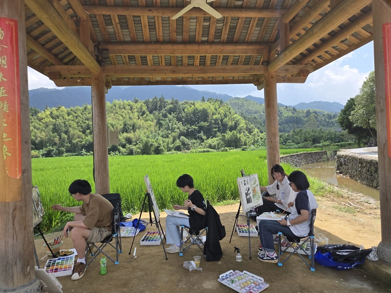 우리는 첫 번째 회원루에서 30분 정도 설명과 함께 시간을 가진 다음 밭을 지나 또 맞은편 3-5분 거리에 위치한 토루박물관으로 유명한 토루지광문화원을 찾았다. 푸젠성토루 자체가 중국에서도 굉장히 이색적인 문화유산의 공간 아닌가? 그래서 가는 곳마다 학생들의 그림을 그리고 있는 모습을 심심찮게 볼 수 있었다. 그늘이 있는 곳, 건물이 전체적으로 색다르게 보이는 곳에는 학생들의 모두 모여 그들의 작품을 보는 재미가 있다.