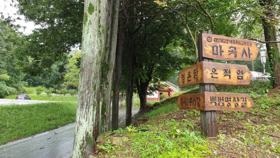 주차장에서 나오는 길에 보니 백범명상길과 마곡사 가는 길이 보인다. 마곡사 건물 뿐 아니라 백범김구의 명상길을 따라 갈 수 있는 트레킹 겸 가벼운 산책로가 있어서, 이곳을 찾는 사람들이라면 사찰의 멋스러움과 길을 따라 걷는 태화산의 정취를 느껴볼 수 있다. 비가 오는 날이라 산책로를 따라 걷기는 어려웠지만, 태화산 자연의 정기를 이어받은 듯한 편안함은 고스란히 공간안에 서 있는 내내 느끼기 좋았다.