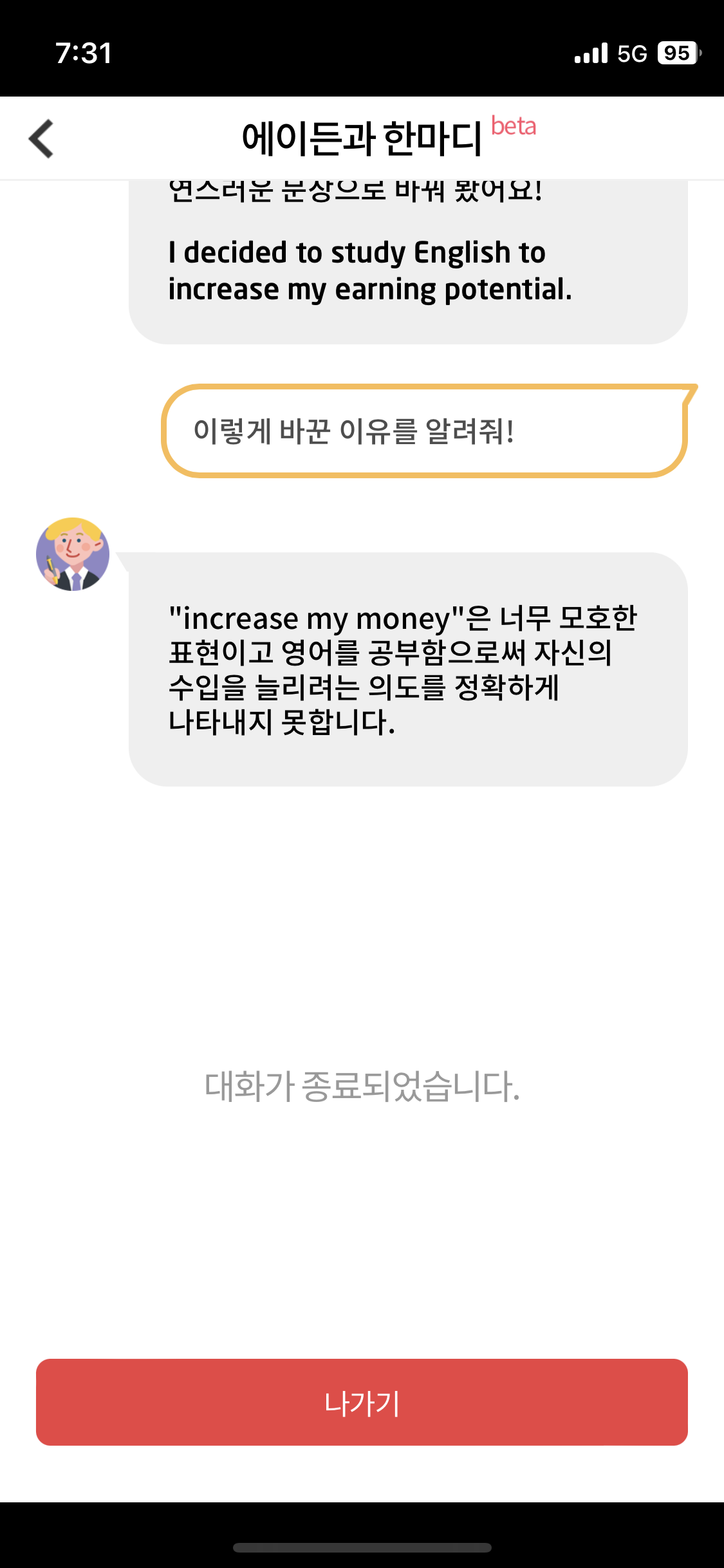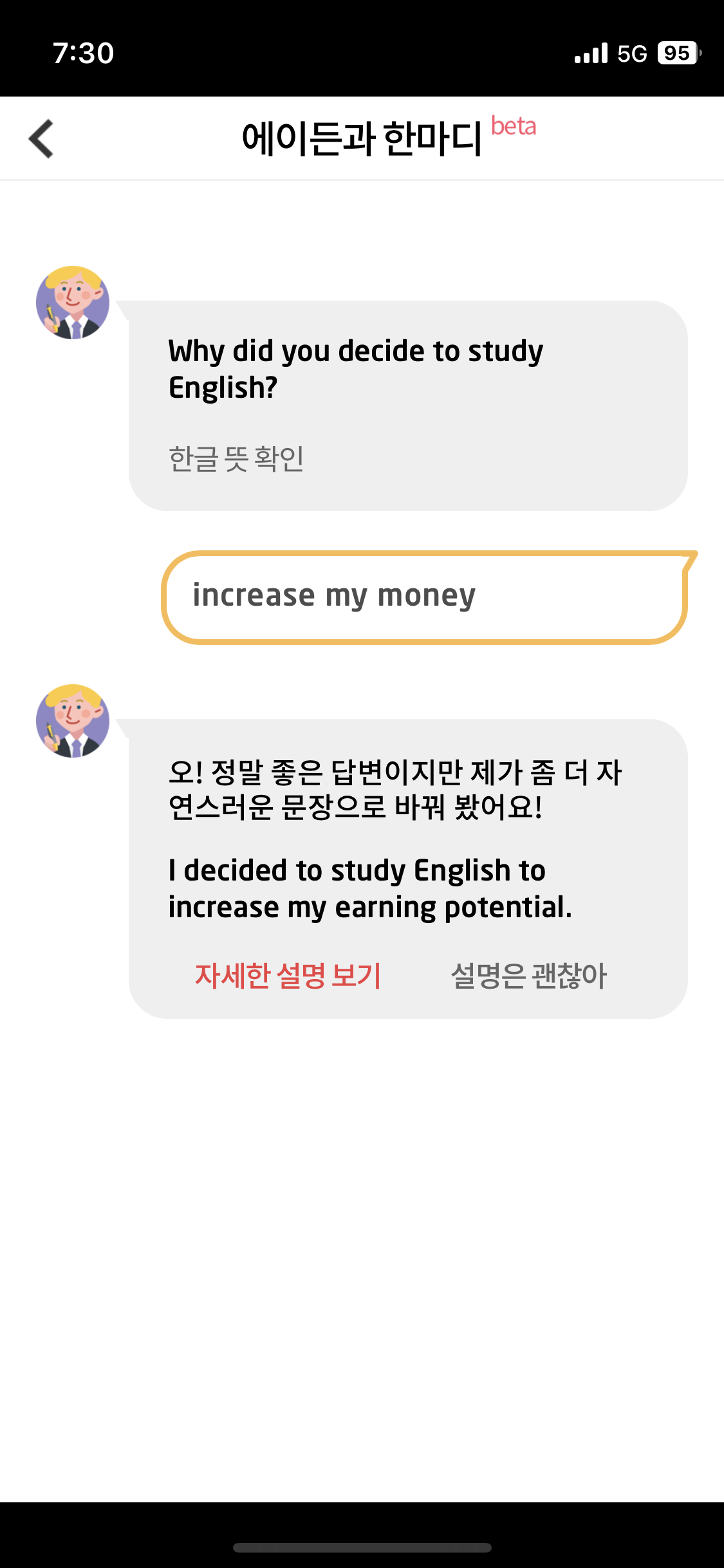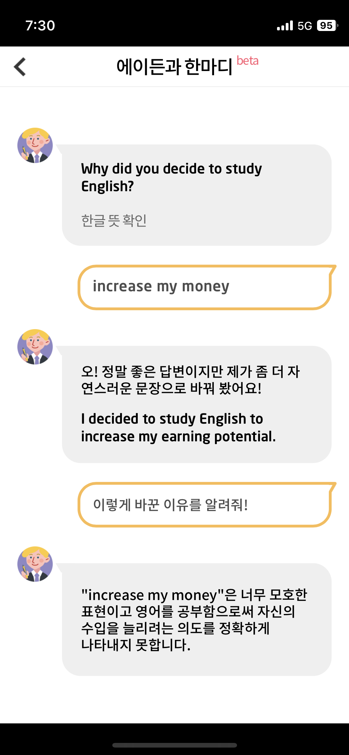 사용자가 답변을 submit한 후 AI가 수정해준 답변이었다.