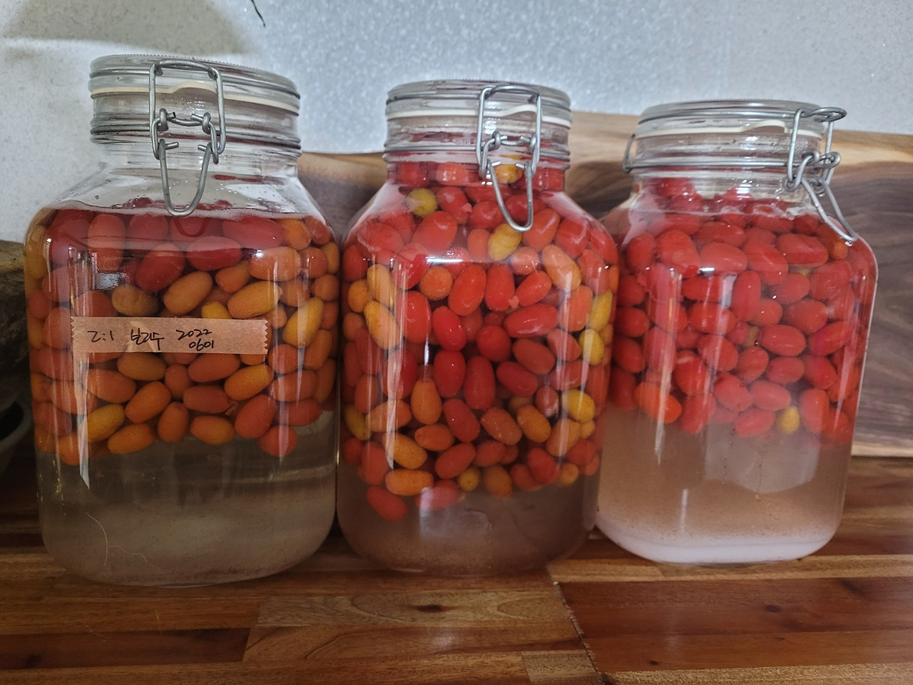 열매가 저리 많이 달리니 딱 한그루만 있으면 충분하다. 열매가 익기 시작하면 순식간이라, 아침에는 약간 초록빛이 돌던 열매가 저녁이면 붉게 변해 따 먹을 수 있다. 그러니 저장성은 떨어질 수밖에 없어, 2~3일 동안 수확한 열매는 모두 담금주를 만들었다.
