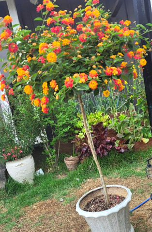 3500원을 주고 산 란타나 모종을 가지 하나만 남기고 계속 잘라내어 외목대로 만들었다. 그렇게 외목대로 2년 동안 키를 키우고 올해로 3년생이 된 우리 집 란타나는 이제 화분 높이를 포함해 내 키보다 크게 자랐다.