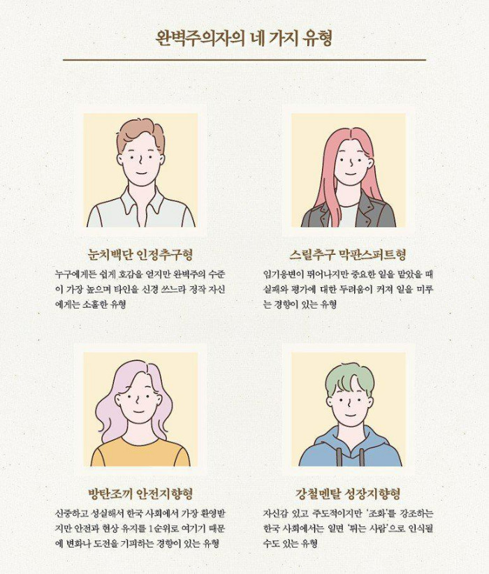 얼마 전 해 본 완벽주의 성향 테스트에서 나는 ‘강철멘탈 성장지향형 완벽주의자’라는 결과가 나왔다. <네 명의 완벽주의자> (이동귀, 손하림, 김서영, 흐름출판, 2021)라는 책에 따르면 완벽주의자에는 아래와 같이 제 가지 유형이 있다고 한다.