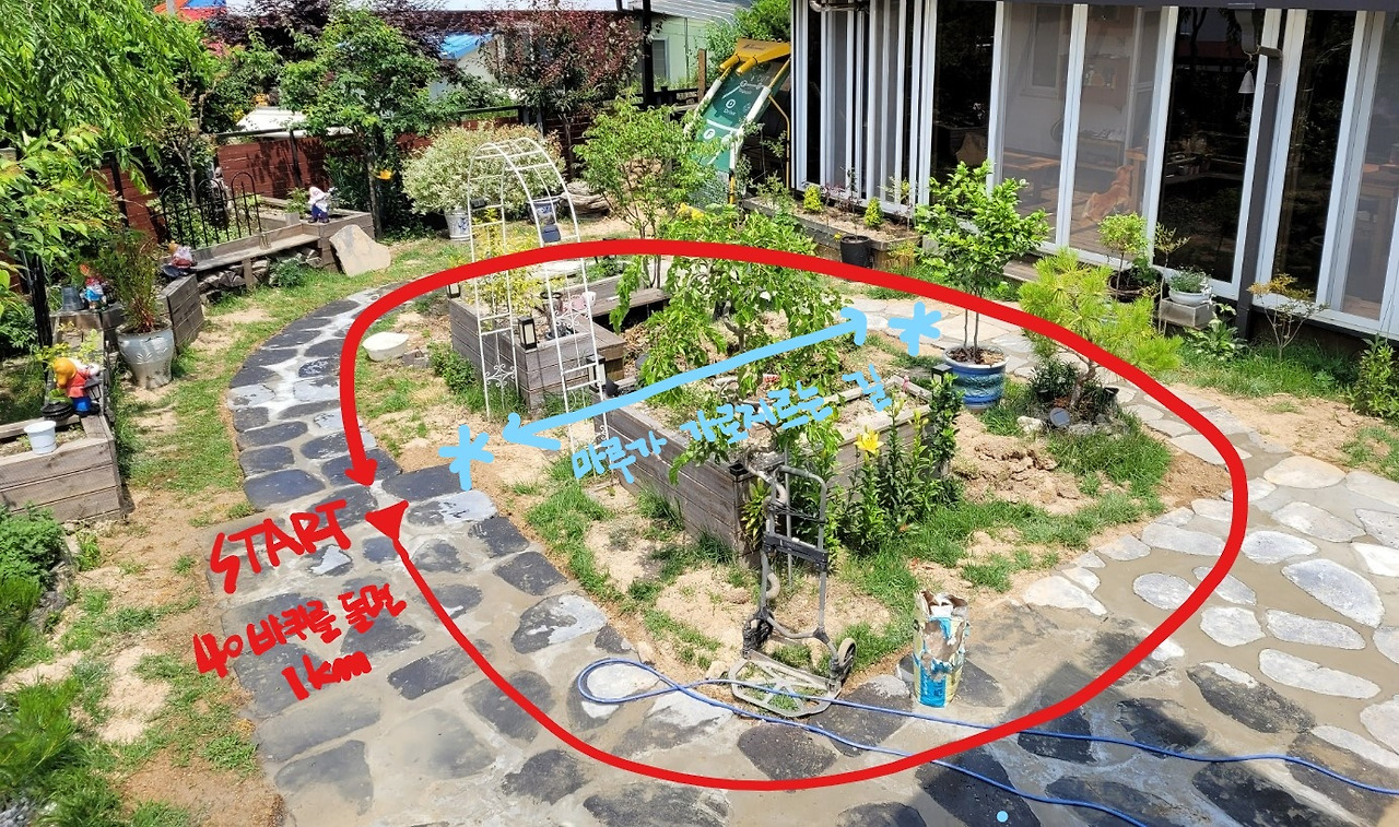 남편의 보폭을 70cm라고 가정하면 마당 1바퀴가 25m, 40바퀴를 돌면 1km가 되니 하루에 40바퀴씩만 돌자고 하였다.