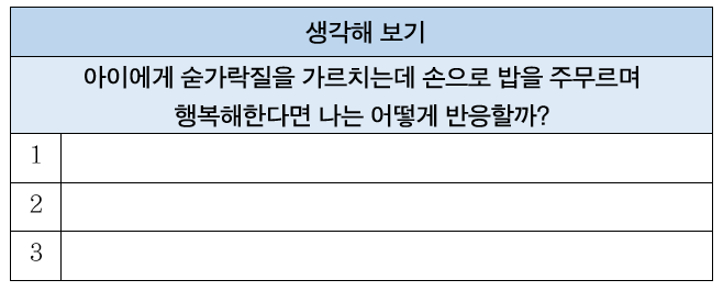 보통 숟가락을 손에 쥐어 주며 밥은 숟가락으로 먹는다고 가르치게 됩니다. 저는 정확히 부모님이 숟가락질을 가르친 방법에 대해 기억이 없습니다. 아마도 부모님의 지시대로 숟가락질을 따라 했던 것 같습니다. 그래서 첫째 딸에게도 숟가락으로 먹으라고 가르쳐주며 따라 하게 했습니다. 첫째 딸은 숟가락질을 아무 저항 없이 빠르게 배웠습니다. 하지만 두 째인 아들은 달랐습니다.