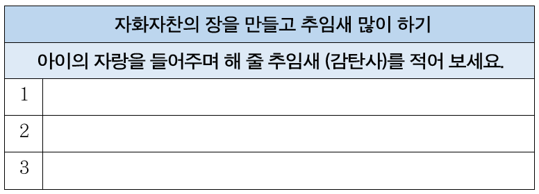 적절한 곳에서 힘을 실어줄 수 있는 추임새, 남발이 아니라 분위기에 맞게 적절히 활용한다면, 아이는 놀랍게 달라질 것입니다. 아래의 추임새 의미를 보면 더 멋진 맞장구를 쳐 줄 수 있을 것입니다. 아이에게 어떤 일이 일어날지 기대해 보세요.