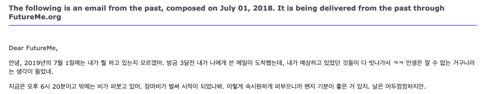그 중의 편지 하나가 2019년 7월의 나에게 전달된 것이다. 재미있게도, 당시 내가 머리 터지게 고민하고 있었던 문제는 지금은 해결이 되어 있었다. 현재의 내가 봤을 때는 '내가 그 문제 때문에 그렇게 힘들어 했었나?'라는 의문이 들 정도로. 역시 인간은 망각의 동물인가 보다. 힘든 순간에는 고통스러워하지만, 힘든 순간이 지나가면 언제 그랬냐?라고 고개를 갸우뚱하는...