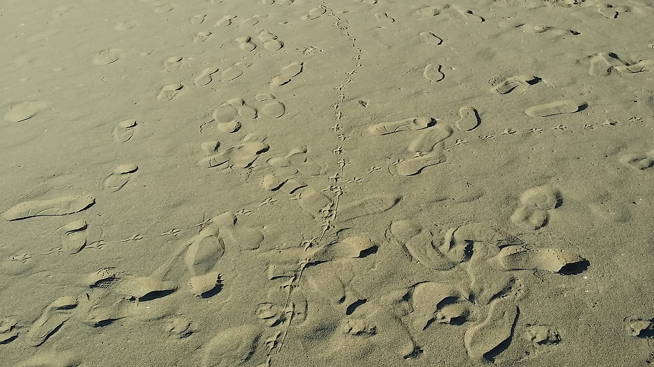 1) 2015년 10월 2일의 부산 송정 해수욕장의 발자국들, 음각이 아니라 양각이다. 사람 발자국 사이에 새 발자국도 보인다. 새의 날갯짓이 공중에 남기는 흔적은 어떤 모양일까? 나르는 새도 걸으니 흔적이 남는다.