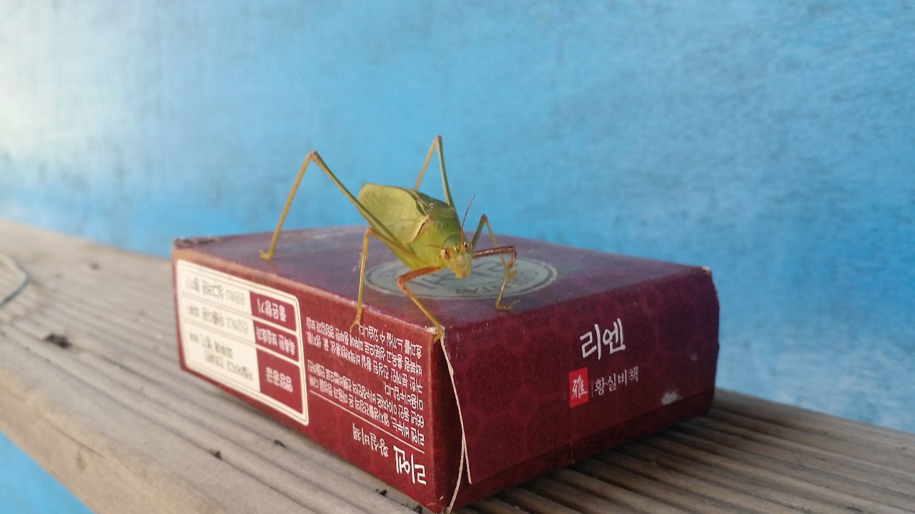 4) 2017년 10월 27일 악양 지리산 산기슭 여기, 버린 비누곽에 메뚜기가 앉아 있다. 하도 꼼짝하지 않기에 계절이 계절인지라 죽은 죽은 줄 알고 손을 댔더니 격하게 반응한다. 한참 후 다시 와 보니 메뚜기는 그 자세 그대로 변함없이 있었다. 손을 대보니 반응이 없다.
