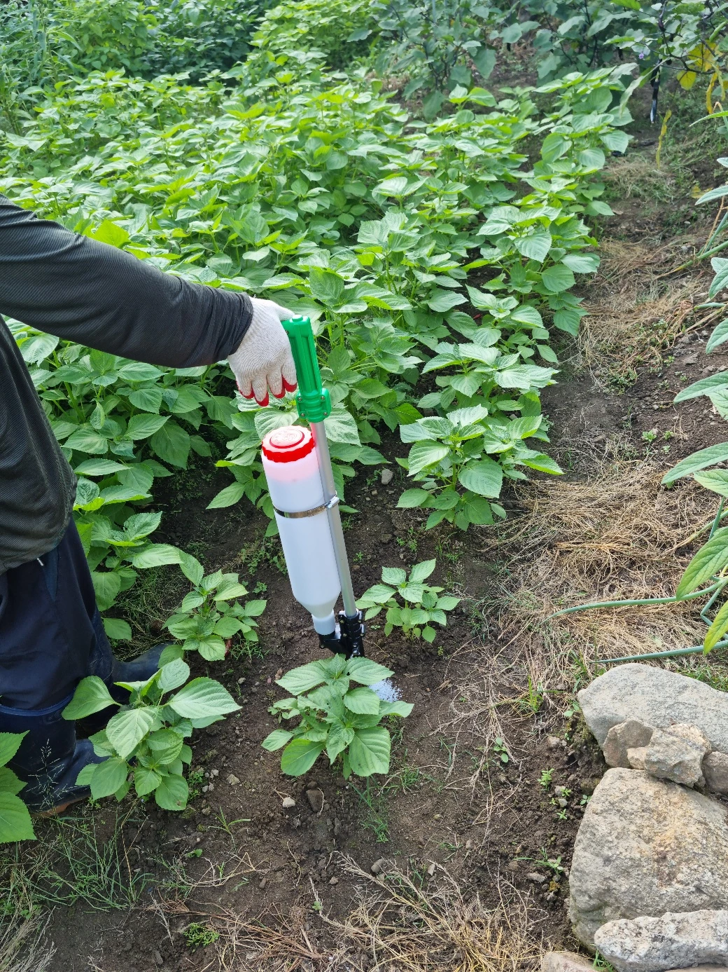 비료 주입기를 구해야겠다는 생각을 여러 해 전부터 하고 있었음에도 실행에 옮기지 못하고 있었는데 이 사태를 계기로 주문, 오늘 도착했다. 받는 즉시 개봉하여 이 걸로 들깨 모종 옆에 요소 비료를 주입했다.