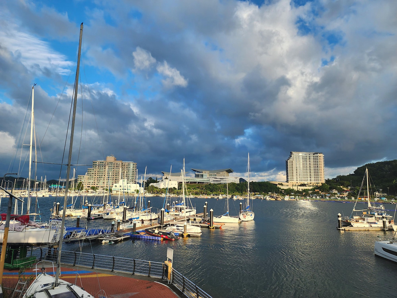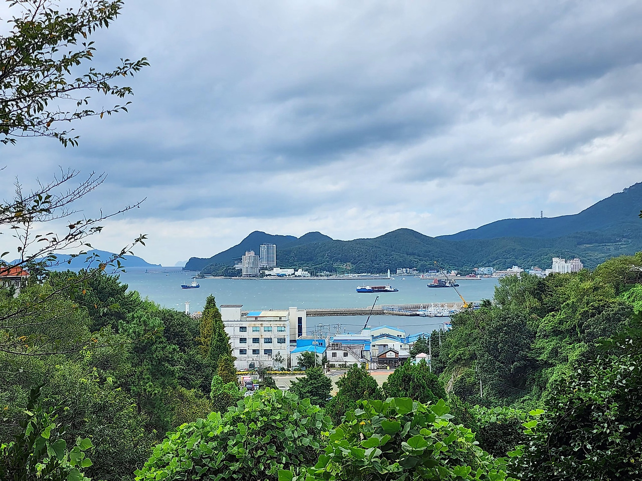 맛 좋은 된장국 해물탕 저녁 식사 후 걷는 해안가 산책길, 태풍 산산의 간접 영향을 받는 통영항의 모습은 약간 긴박하고도 드라마틱하다. 어두운 구름이 하늘을 뒤덮으며 점점 더 짙어지고, 바다는 차가운 회색빛으로 변해 간다. 상당히 세찬 바람에 정박해 있는 배들이 이리저리 흔들리고, 파도는 부두를 제법 거세게 때린다. 나무들은 강한 바람에 이른바 '삐끼삐끼 춤'을 격렬하게 추고 있고.
