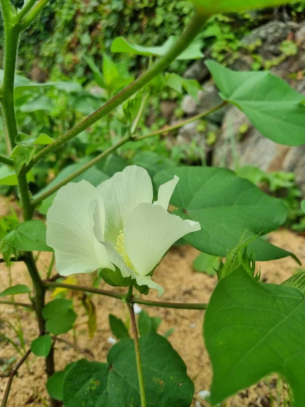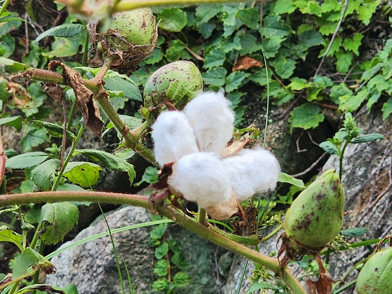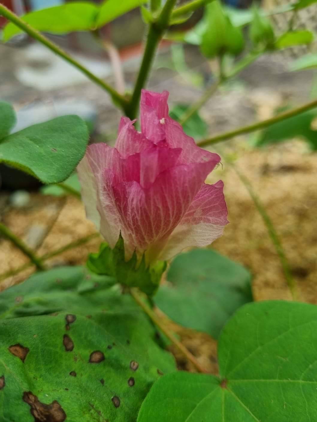 그런데 가만 보니, 그게 그저께는 미색이었는데 어제는 분홍이더니 오늘은 진홍이다가 다음 날 보니 꽃이 사라지고 없다. 유소년 시절의 동네 인근 목화밭의 꽃색 이미지나, 경남 산청군 단성면에 있는 문익점 목화 시배지의 제철 목화밭 방문에서 본 목화꽃 이미지는 변색하는 게 아니라 미색 하나 단색이었다. 그래서 목화가 이런 변색 과정을 거쳐 마지막엔 하얀 목화송이로 된다는 걸 그때는 알아채지 못했었다.