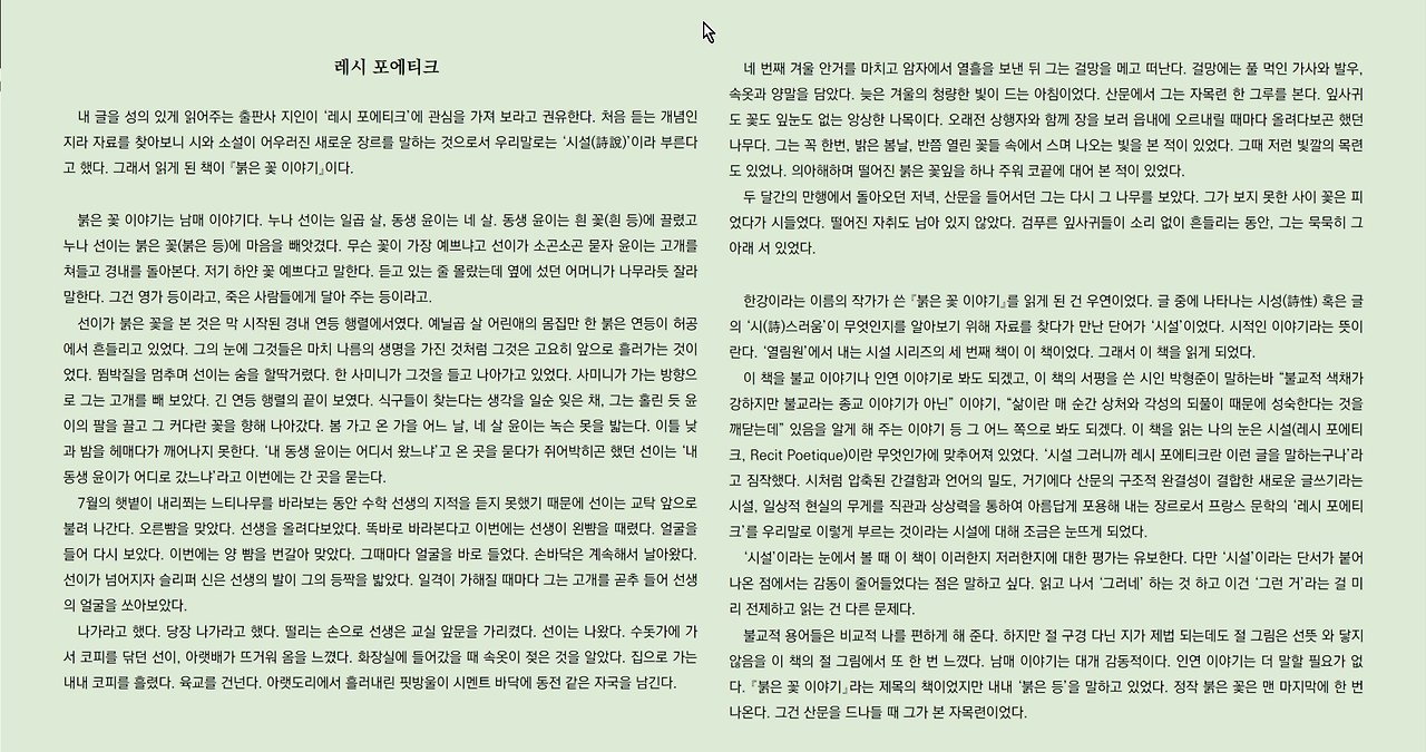 레시 포에티크로서의 붉은 꽃 이야기를 읽은 소감을 난 나의 세 번째 산문집 『언제나 강 저편』314~315 페이지에 수록했었다. 그걸 여기 옮겨본다. 작가 한강의 글에 대한 첫인상을 말해보기 위해서이다.