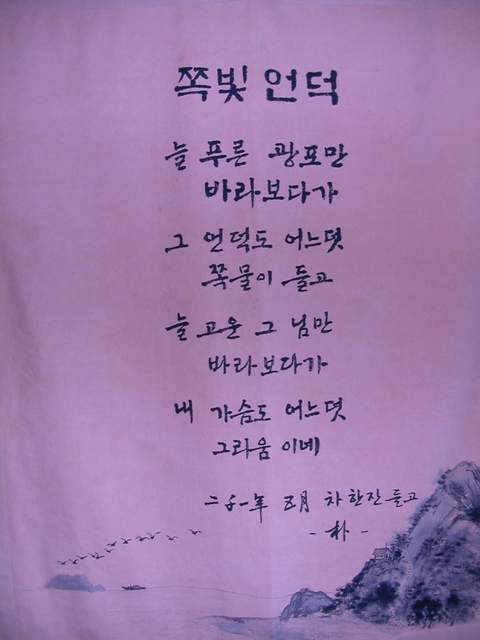 2002년 가을, 편과 함께 삼천포 실안 해안도로를 따라 광포만을 지나던 중이었다. 길가에 조용히 자리 잡은 찻집 하나가 눈에 들어왔다. 이름은 ‘쪽빛 언덕’. 우리는 이끌리듯 그 안으로 들어섰다. 창가에 마주 앉으니 창 아래 바다엔 밧줄에 묶인 배들이 줄지어 정박해 있었다. 마치 세월의 포로처럼, 꼼짝도 않고 고요히 멈춰 있었다. 그리고 벽 한쪽에는 ‘쪽빛 언덕’이라는 제목의 시가 적힌 자줏빛 베가 걸려 있었다.