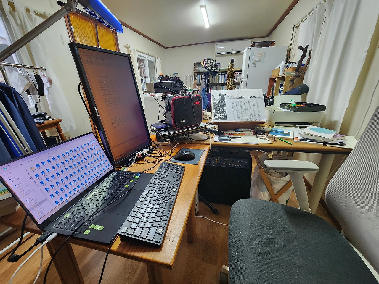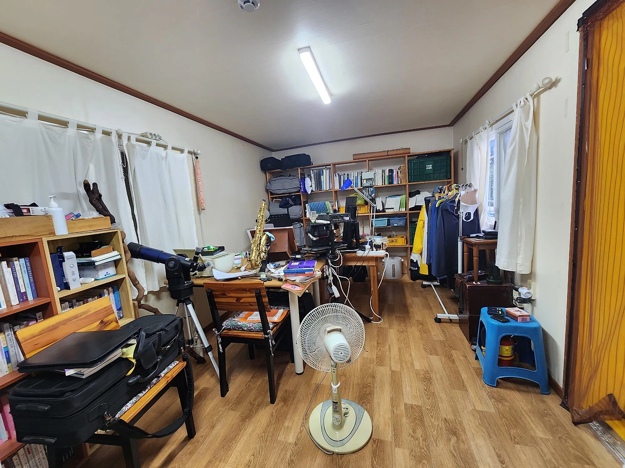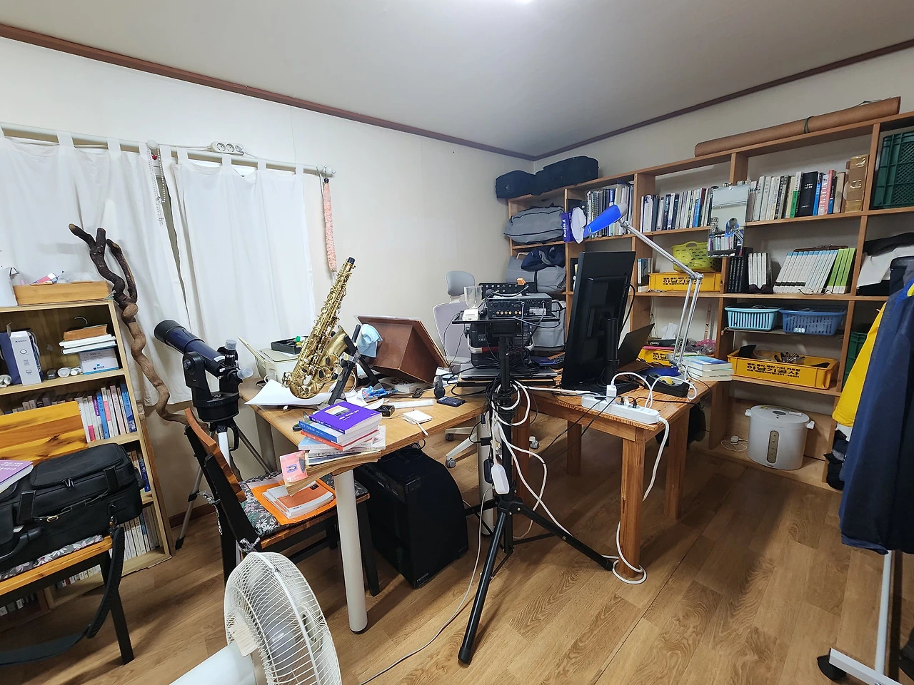 그래서 먼저, 방은 나를 닮았다. 정리되지 못한 책더미와 기록물 속에는 내 안의 욕망과 미완의 흔적이 숨어 있고, 구석에 서 있는 낡은 도사 지팡이는 버리지 못하는 추억을 증언한다. 이 방은 말없이 내 성격을 드러내는 거울이자, 나도 모르게 써 내려간 자서전이다.